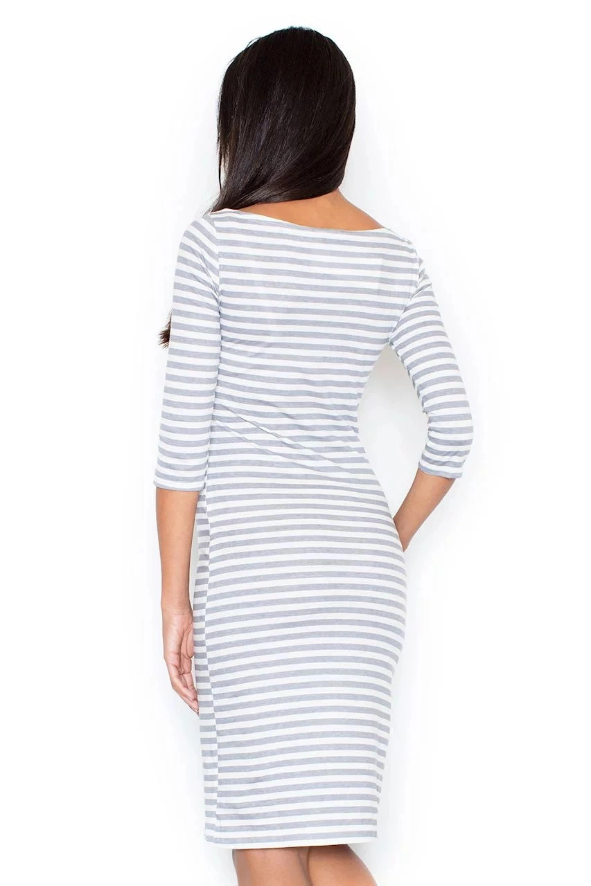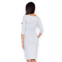 Módne pruhované dámske šaty majú jednoduchý strih a 3/4 rukávy. Majú dĺžku pod kolená a okrúhly výstrih.vhodné na jar a leto.