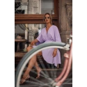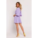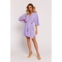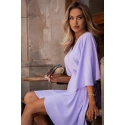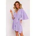 Tkaný krepový materiál, rozšírené mini šaty s krátkymi netopierími rukávmi, zavinovací dizajn so skrytým zaväzovaním a ozdobnou sponou na boku, čiastočne elastický pás, naša modelka meria 171 cm a nosí veľkosť s, navrhnuté a vyrobené v Poľsku.