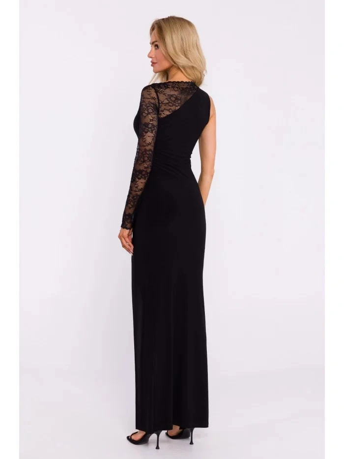 INFORMÁCIE O PRODUKTE: úpletová tkanina a elastická čipka asymetrické maxi šaty s čipkovým rukávom vysoký rozparok vpredu skrytý bočný zips bez podšívky naša modelka je vysoká 171 cm a nosí veľkosť S navrhnuté a vyrobené v Poľsku