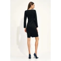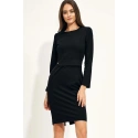 Priliehavé šaty s dlhými rukávmi ukončenými na úrovni kolien, s polguľatým výstrihom a rázporkom na zadnej strane sukne. Zapína sa na zips. Má prednú ozdobu v páse.