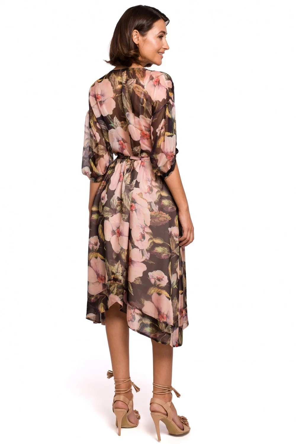 Elegantné dámske kvetované šaty s krátkym rukávom a prekladaným výstrihom do V. Šaty sú vyrobené z p