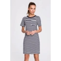 Zvoľte športovú eleganciu a vyberte si jednoduché šaty v námorníckych pruhoch s kontrastným výstrihom a vreckami.