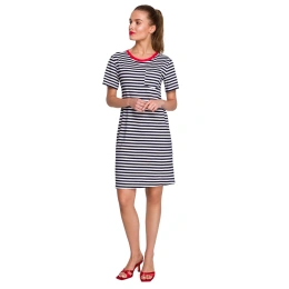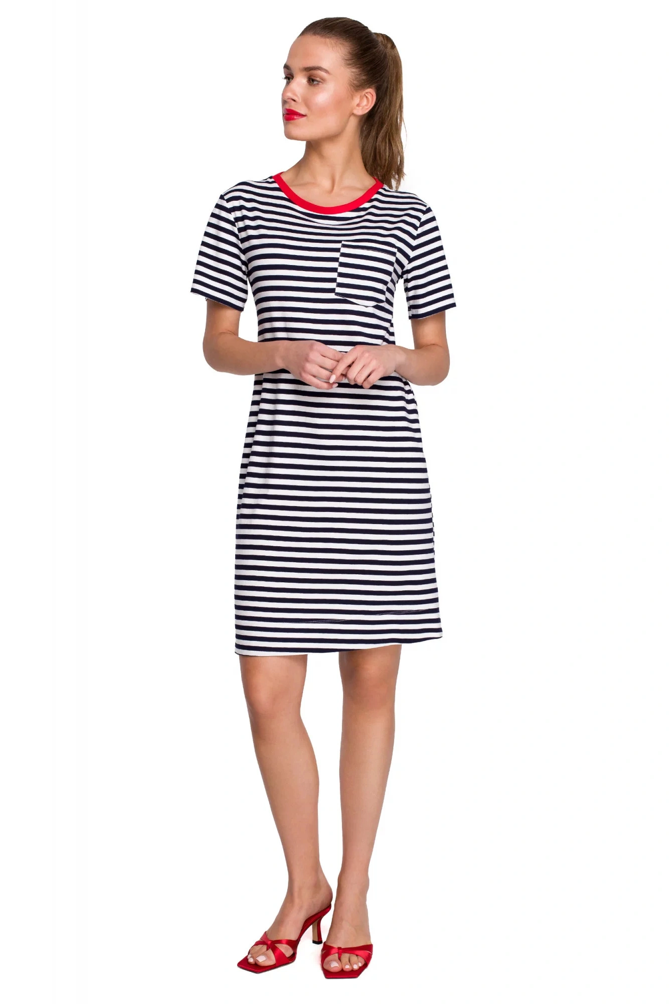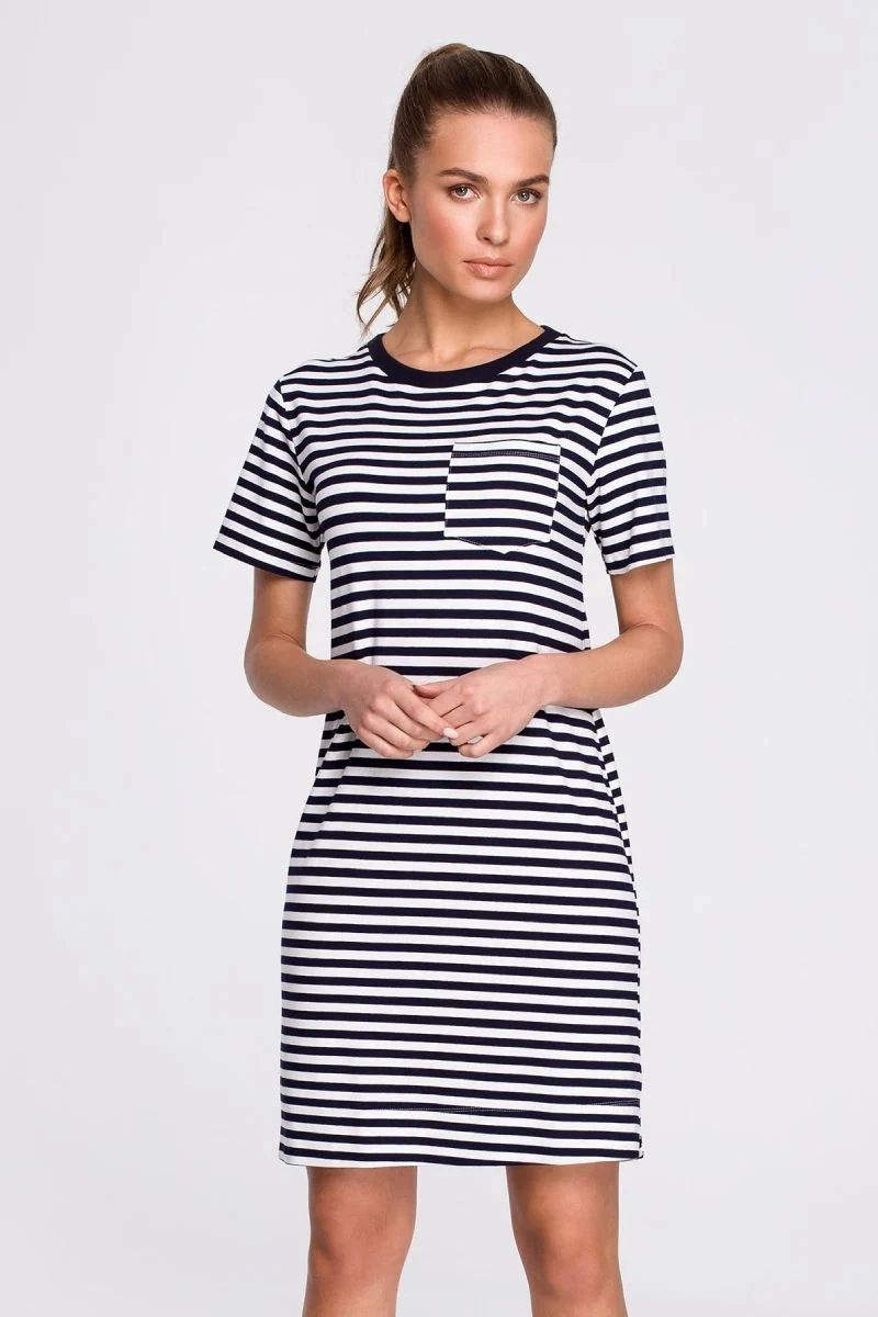 Zvoľte športovú eleganciu a vyberte si jednoduché šaty v námorníckych pruhoch s kontrastným výstrihom a vreckami.