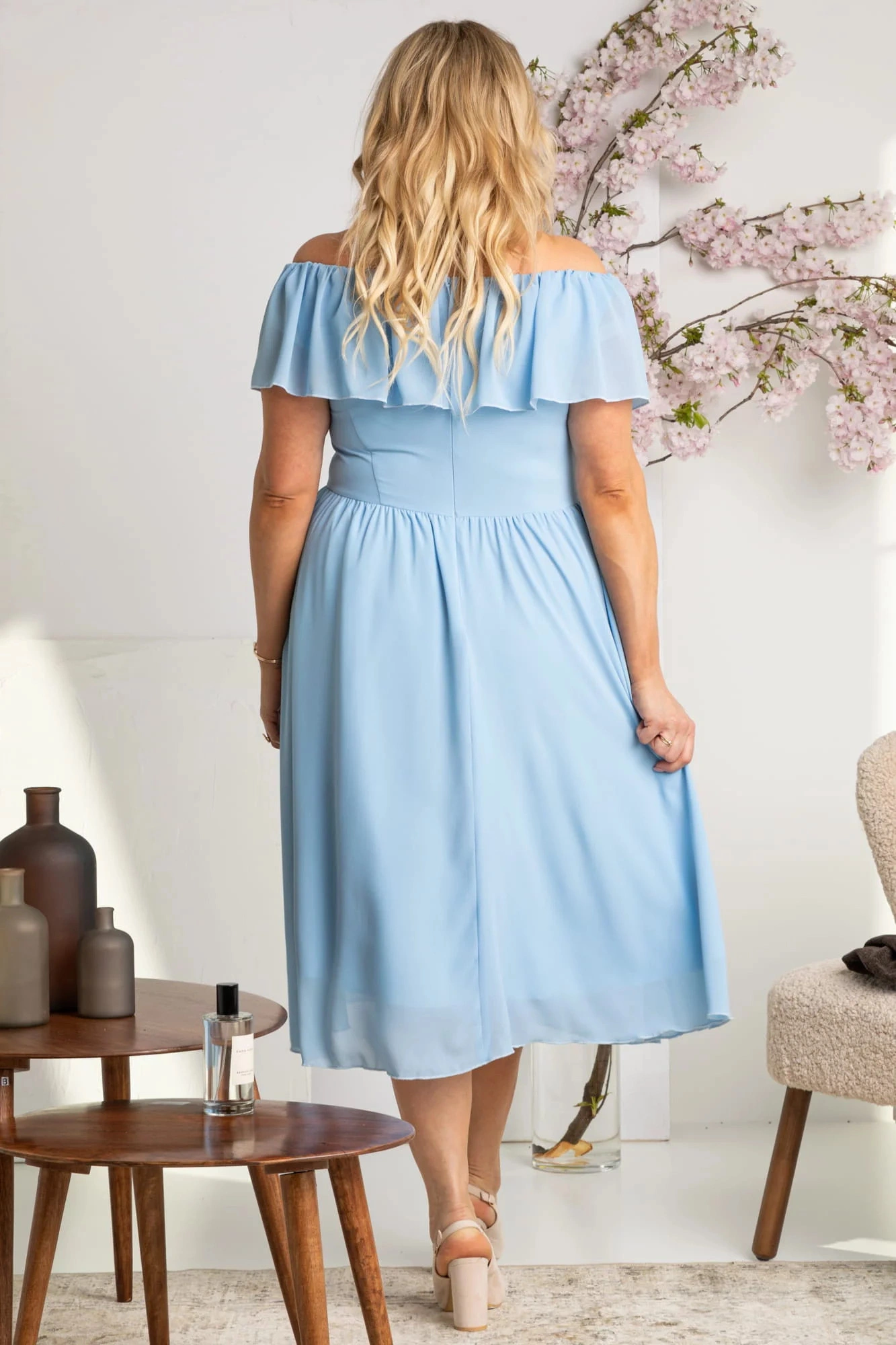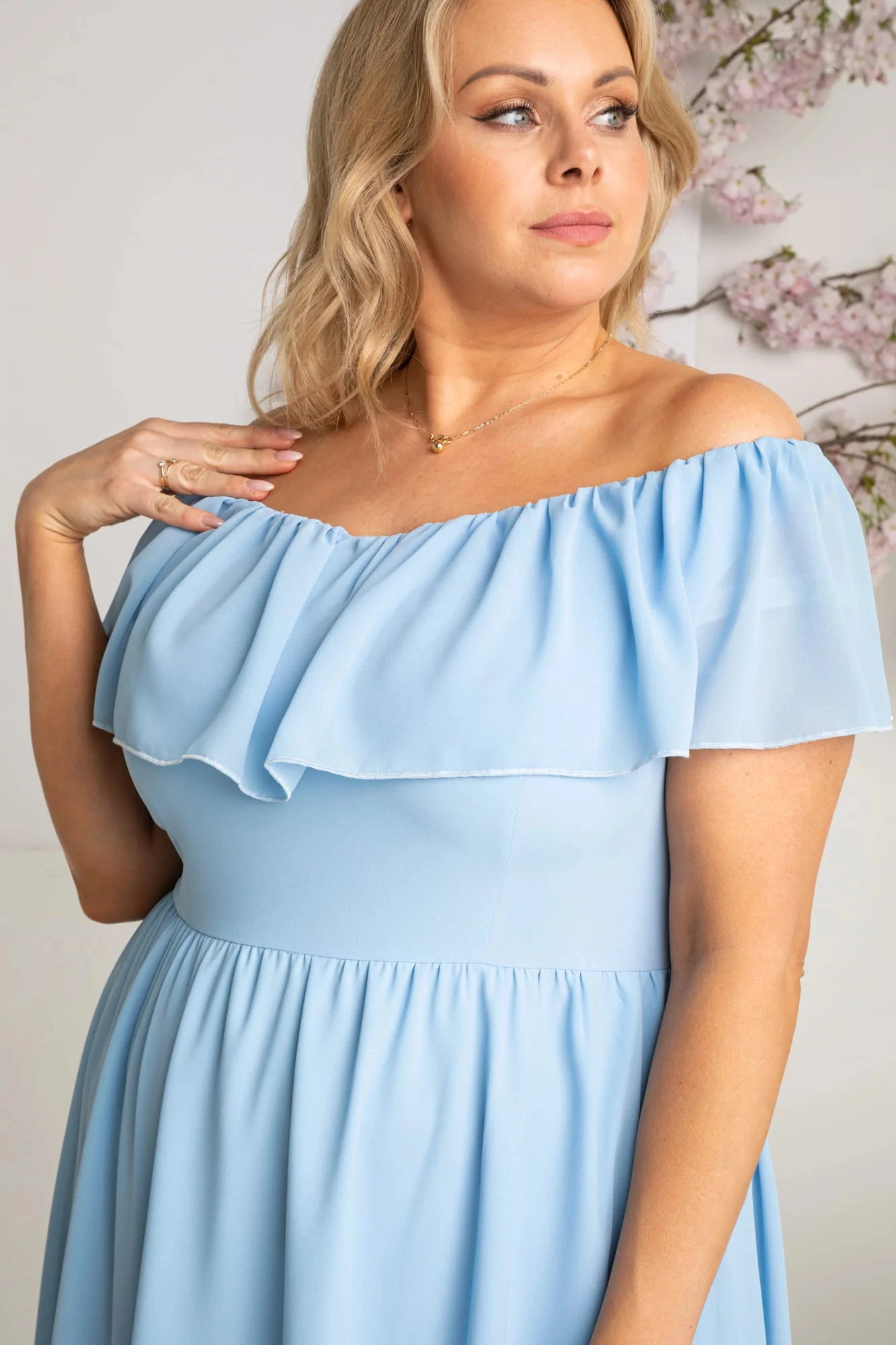 Ľahké, vzdušné šaty s výstrihom na ramienka a hlbokým stojačikom. Malá prestávka na chrbte a zaväzov