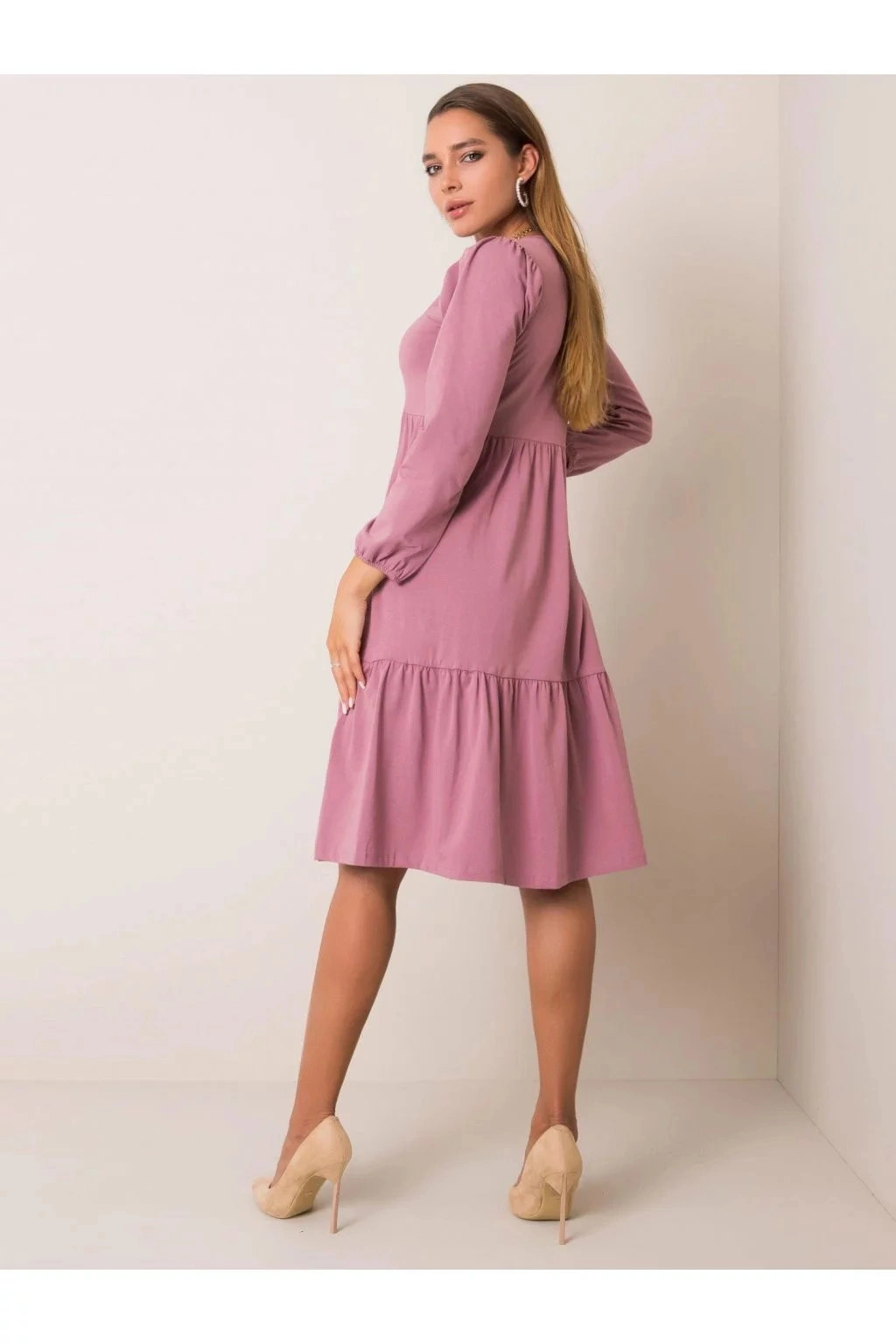 Modelka má na sebe veľkosť S. Miery modelky: výška 170 cm, prsia 85 cm, pás 59 cm, boky 89 cm.