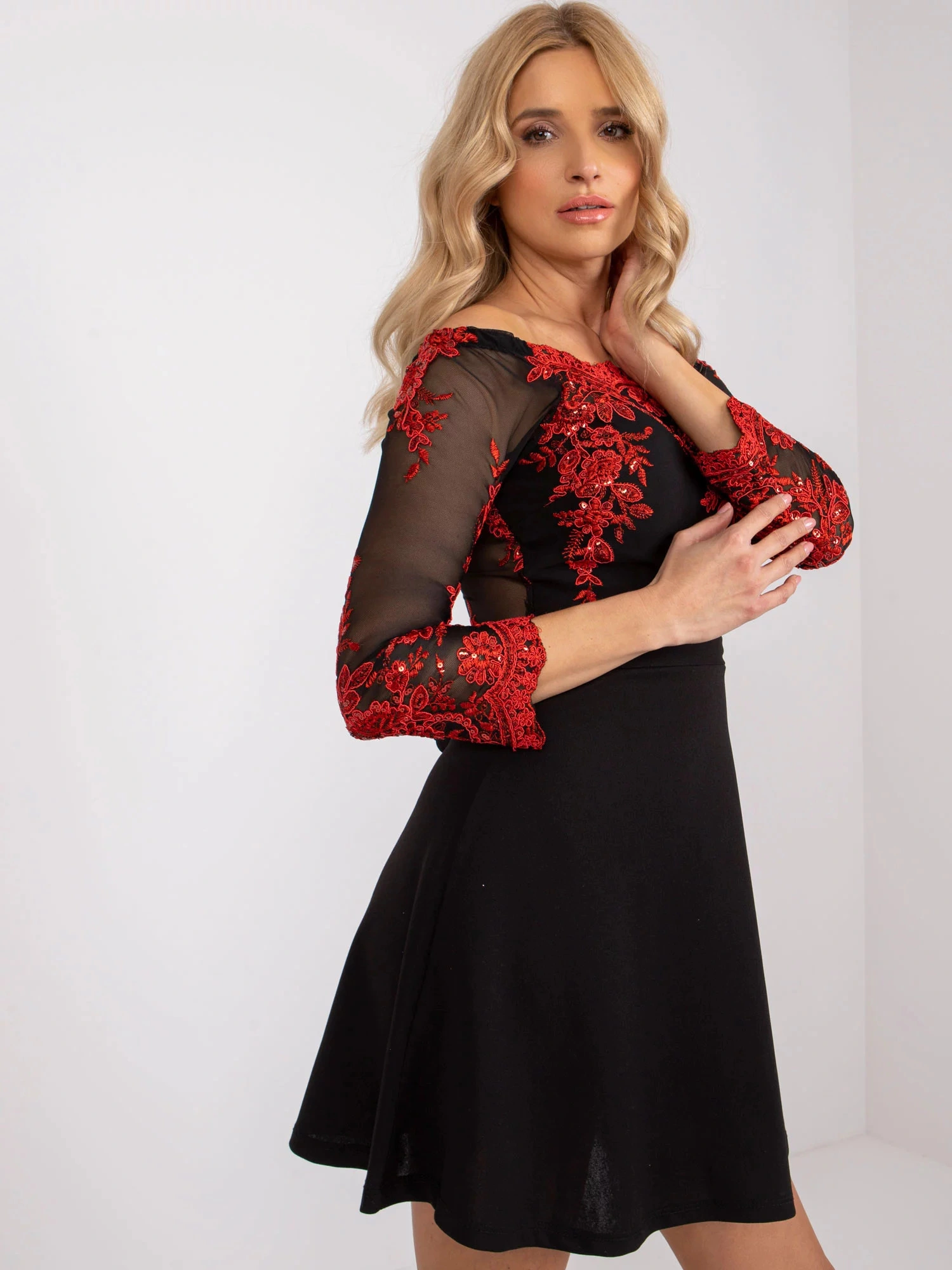 Modelka má na sebe jednu veľkosť. Rozmery modelky: výška 175 cm, prsia 84 cm, pás 65 cm, boky 92 cm.