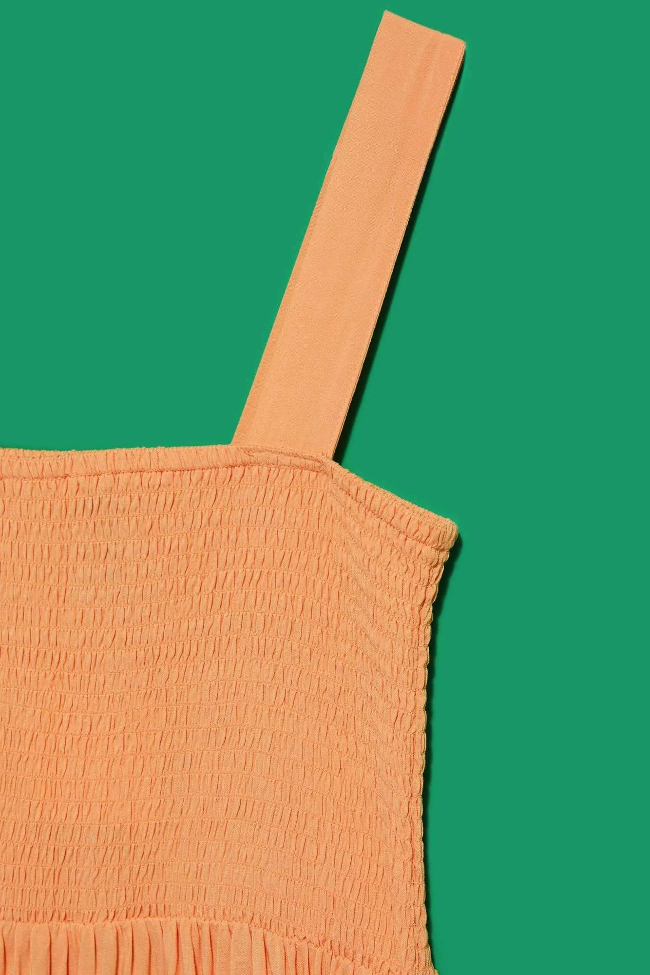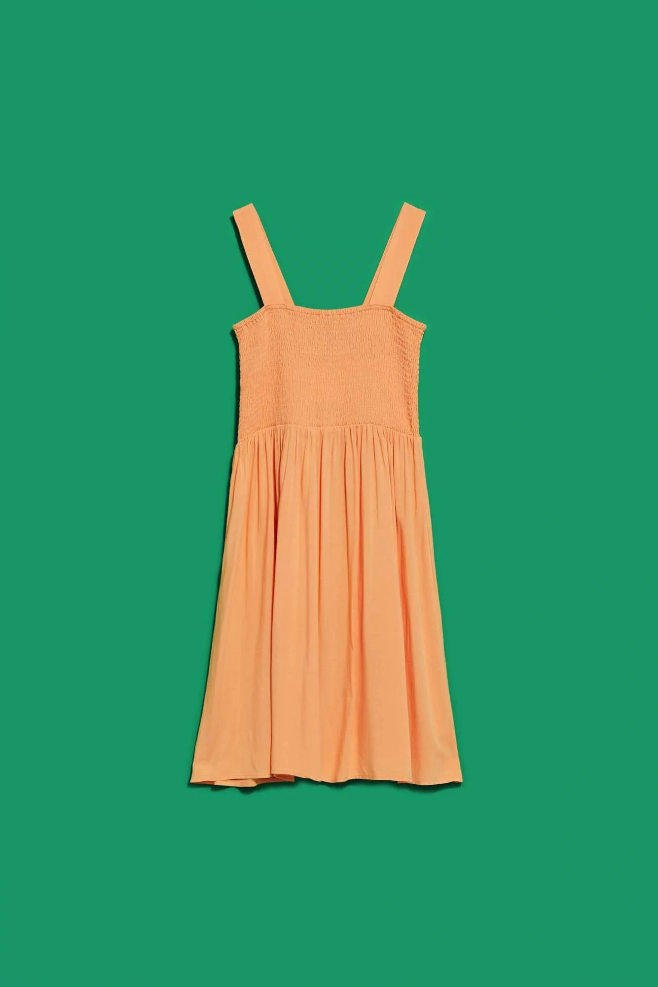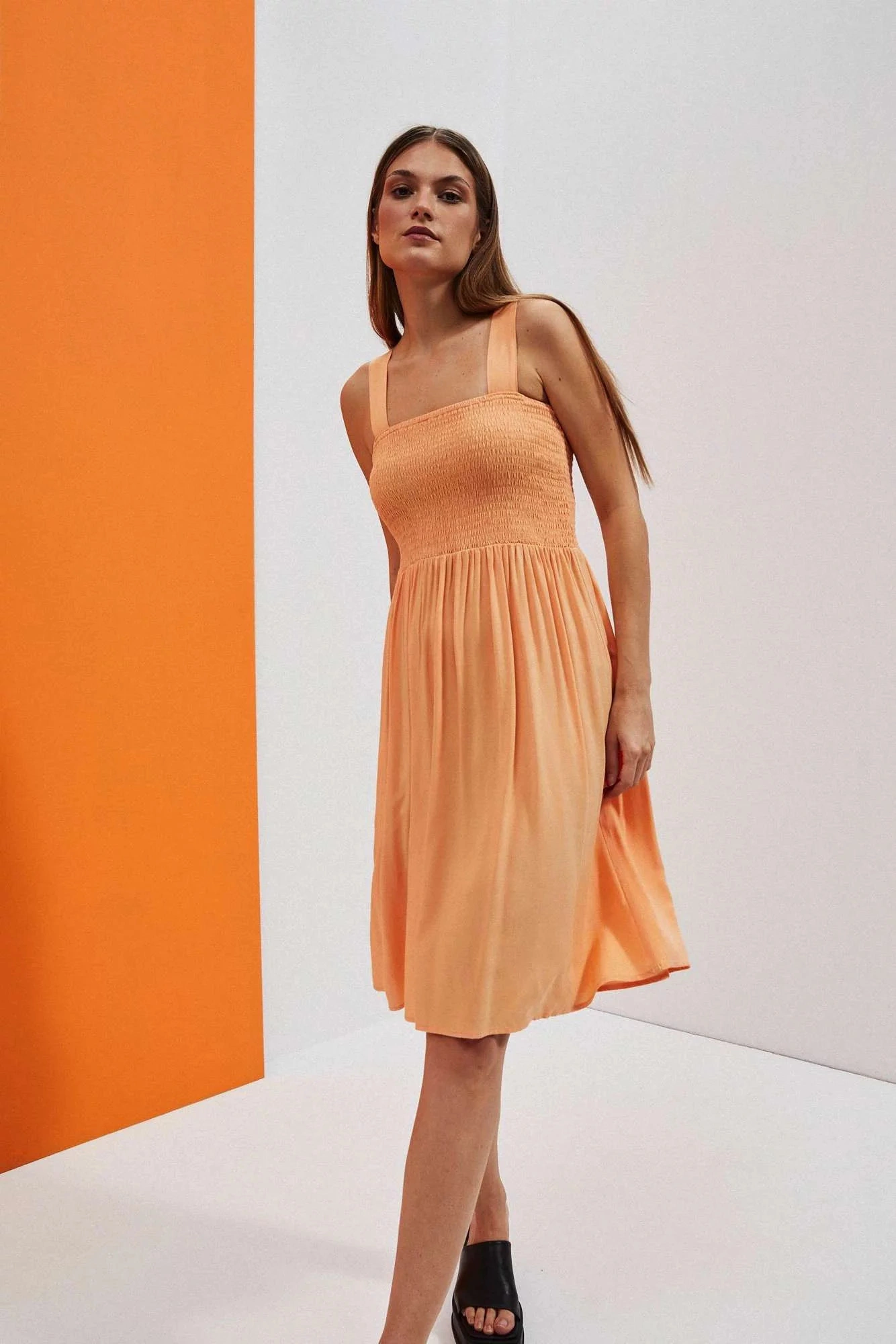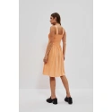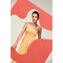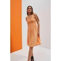Mimoriadne ženské šaty s otvorenými ramenami, široké ramienka. Oranžová farba. Hladké, bez vzorov. Vrchná časť šiat je vo forme šnúrky. Dokonale sa prispôsobí postave a zvýrazní ženské tvary. Spodná časť šiat je voľná, voľná a rozšírená. Dĺžka nad kolená. Vyrobené z na dotyk príjemnej a vzdušnej viskózy. Ideálne na pláž a každodenné štylizácie. Perfektné na leto, musíte ich mať!