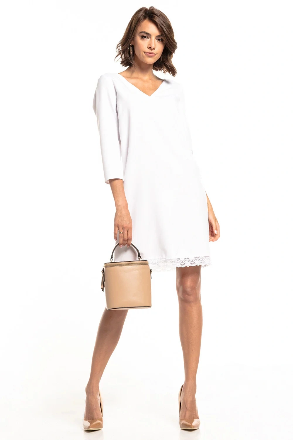 Jednoduché šaty so srdiečkovým výstrihom, dole zakončené čipkou.