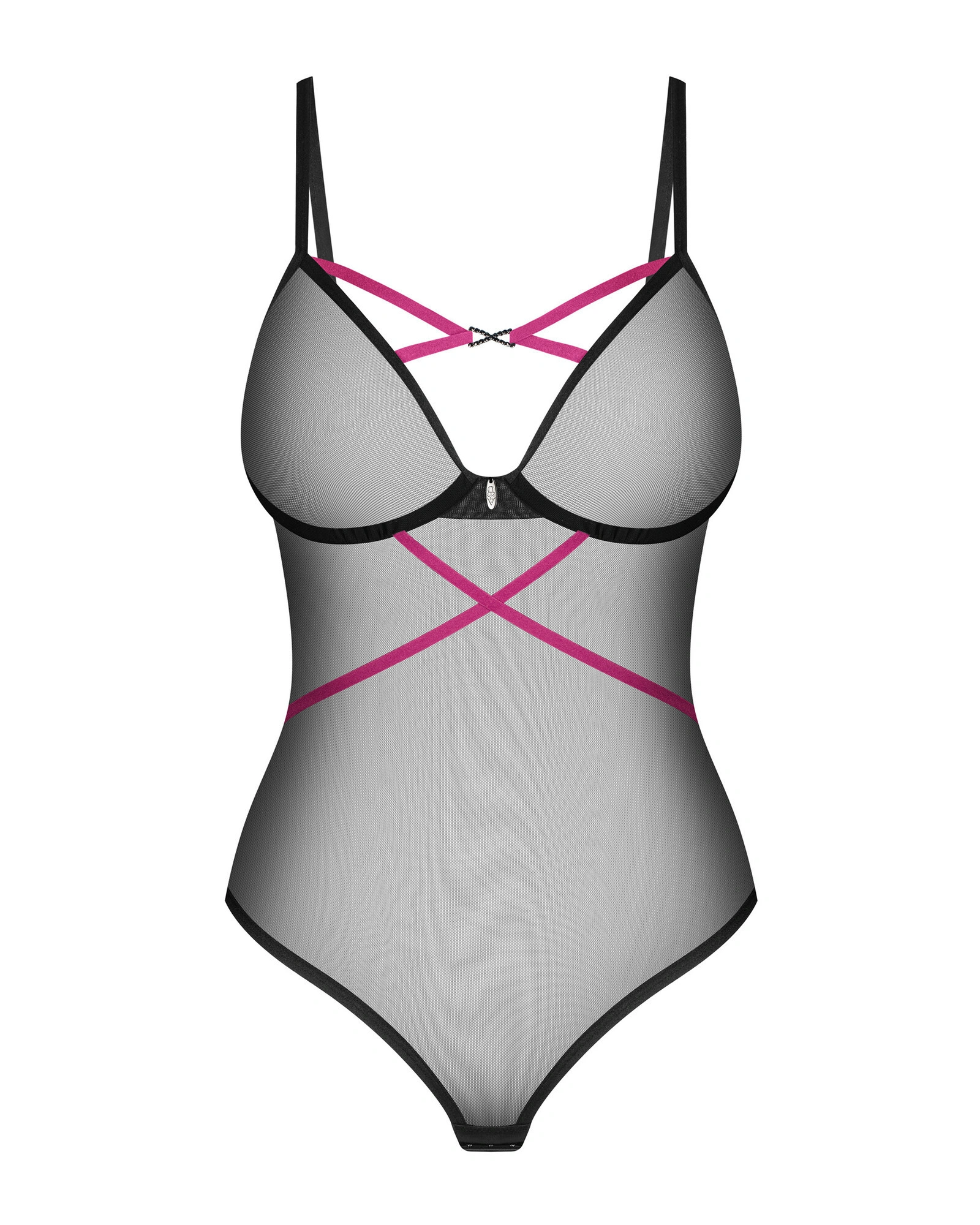Sexi minimalizmus s fialovými akcentmi - kombinácia, ktorá určite zanechá dojem! Toto body má klasický strih. Materiál strihaný vysoko na zadočku spolu s kosticami zaručuje zvodný vzhľad. Fialové ramienka sa ľahko obtáčajú okolo pása a zvodne sa krížia medzi košíčkami, čím priťahujú pohľad. Cíťte sa sebaisto v spodnej bielizni Novenes a vytvorte si spomienky plné intimity.