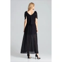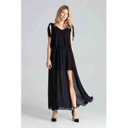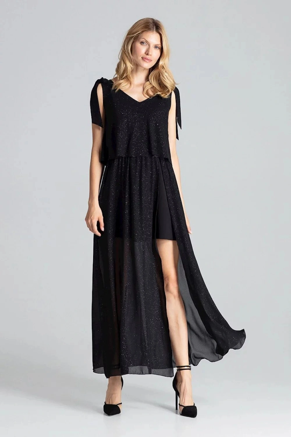 Čierne dlhé zmyselné šaty bez rukávov, zaväzované na ramenách, s veľkým hlbokým výstrihom. Horná časť šiat je zdobená vzdušnou látkou. V páse je pružný opasok a na ľavej strane je v páse rozparok. Pod nimi čiastočne vypasované šaty s mierne rozšíreným spodným okrajom pred kolenami.