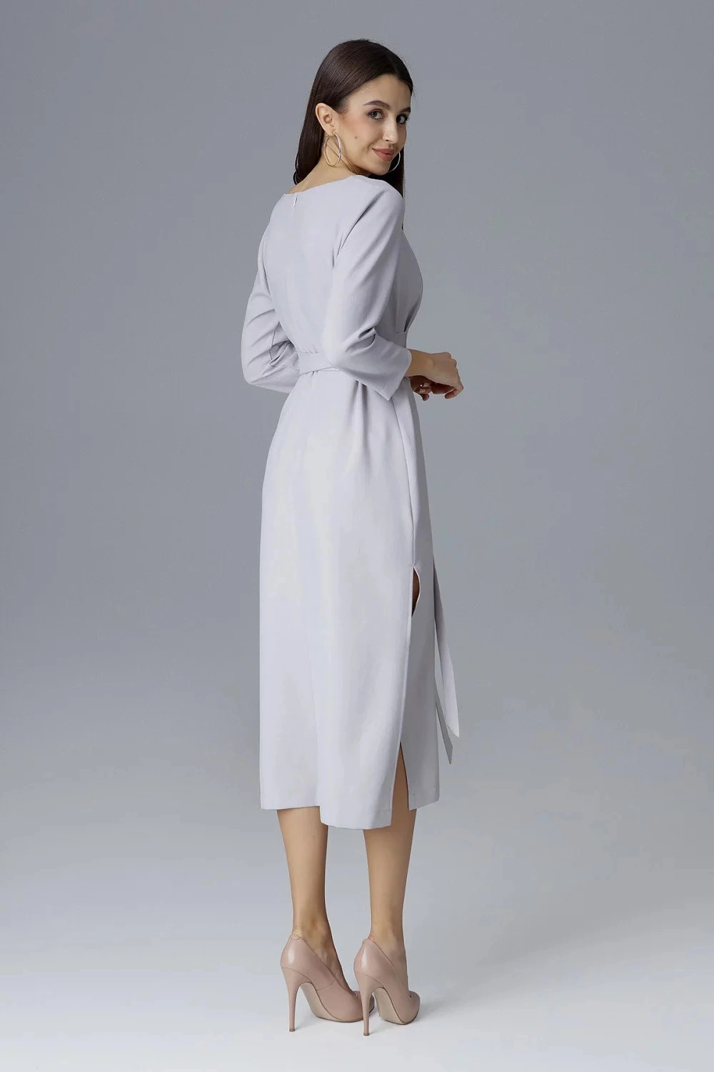 Šedé midi šaty s véčkovým výstrihom a elastickým pásikom v páse. Prídavný látkový opasok. Asymetrick