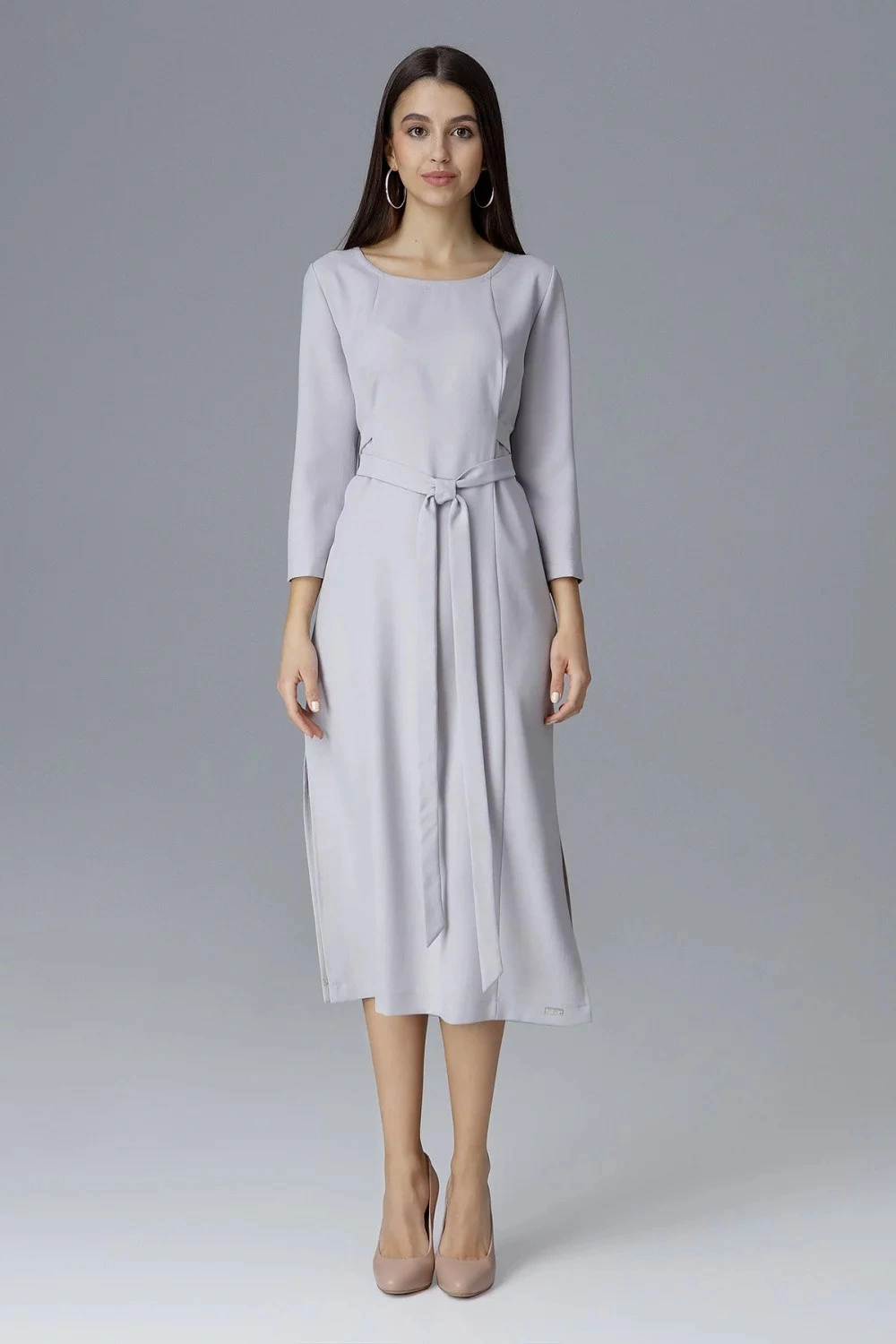 Šedé trapézové midi šaty s dlhými bufetovými rukávmi zakončenými riasením, bez podšívky, bez vreciek