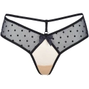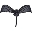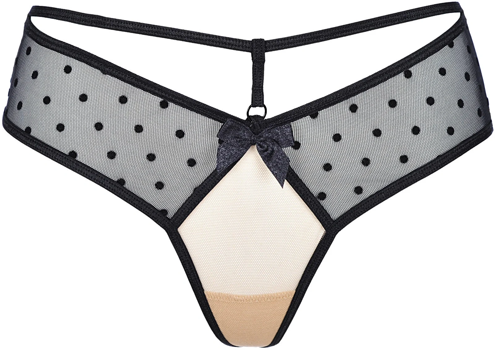 Dômyselné tangá V-9058 ušité z priehľadnej bodkovanej látky so sexi výrezmi a koketným pásikom rozpaľujú zmysly, najmä v kombinácii s podprsenkou V-9051 a samodržiacimi pančuchami V-6124.
