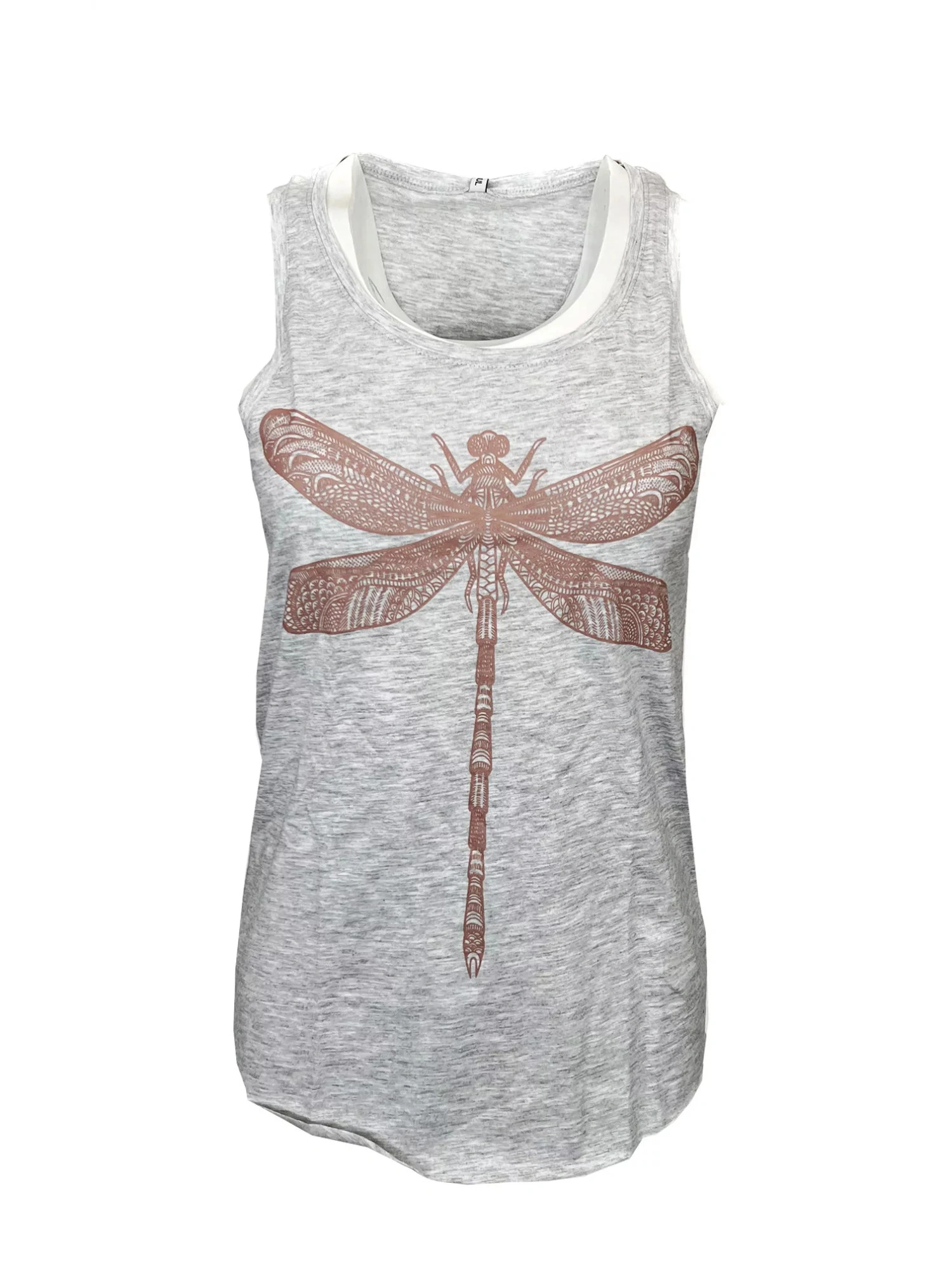 Dámske letné tielko s potlačou veľkej vážky. Veľmi príjemný materiál. Spodná časť tielka strihaná do oblúka.