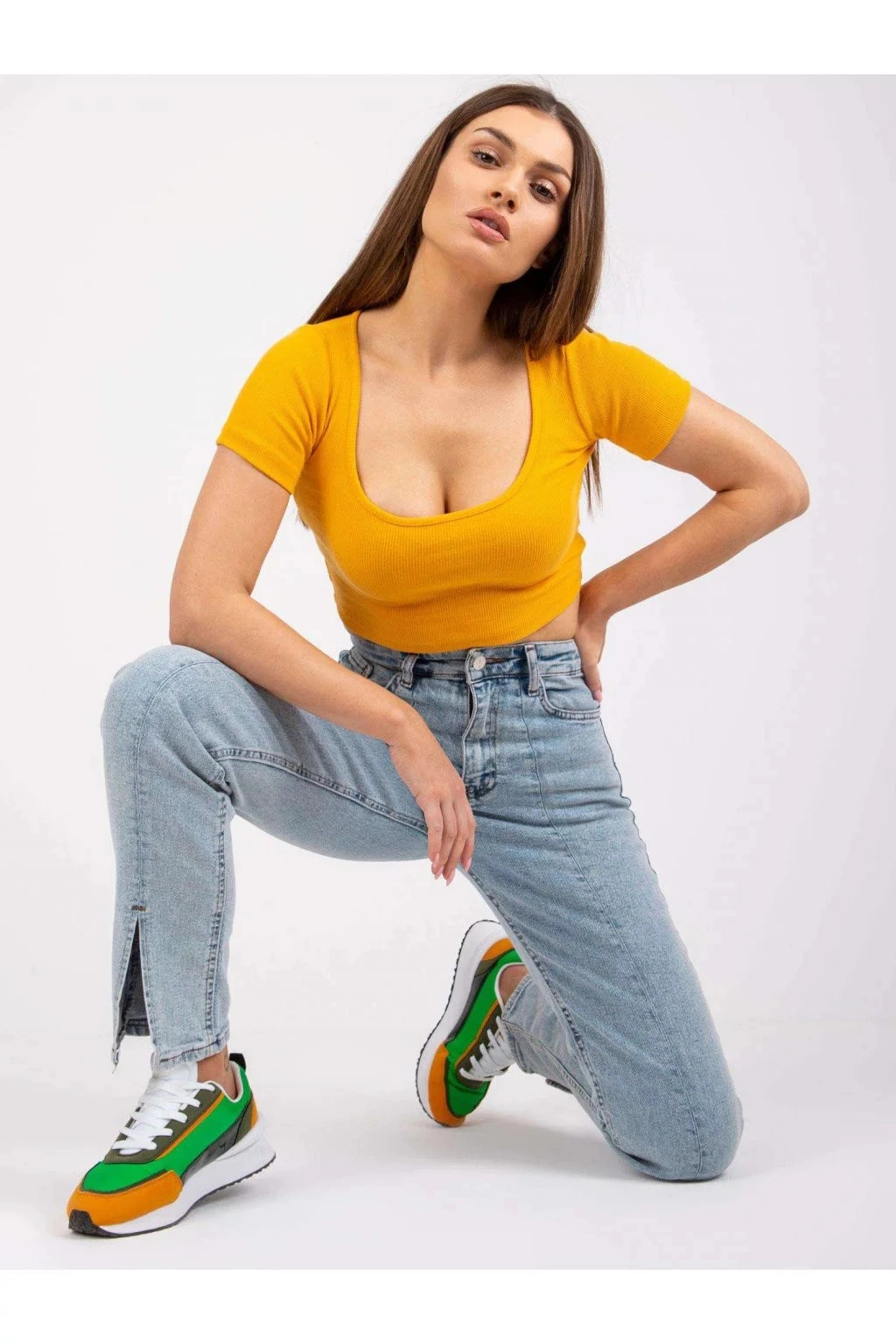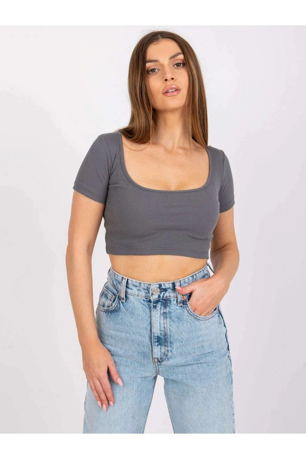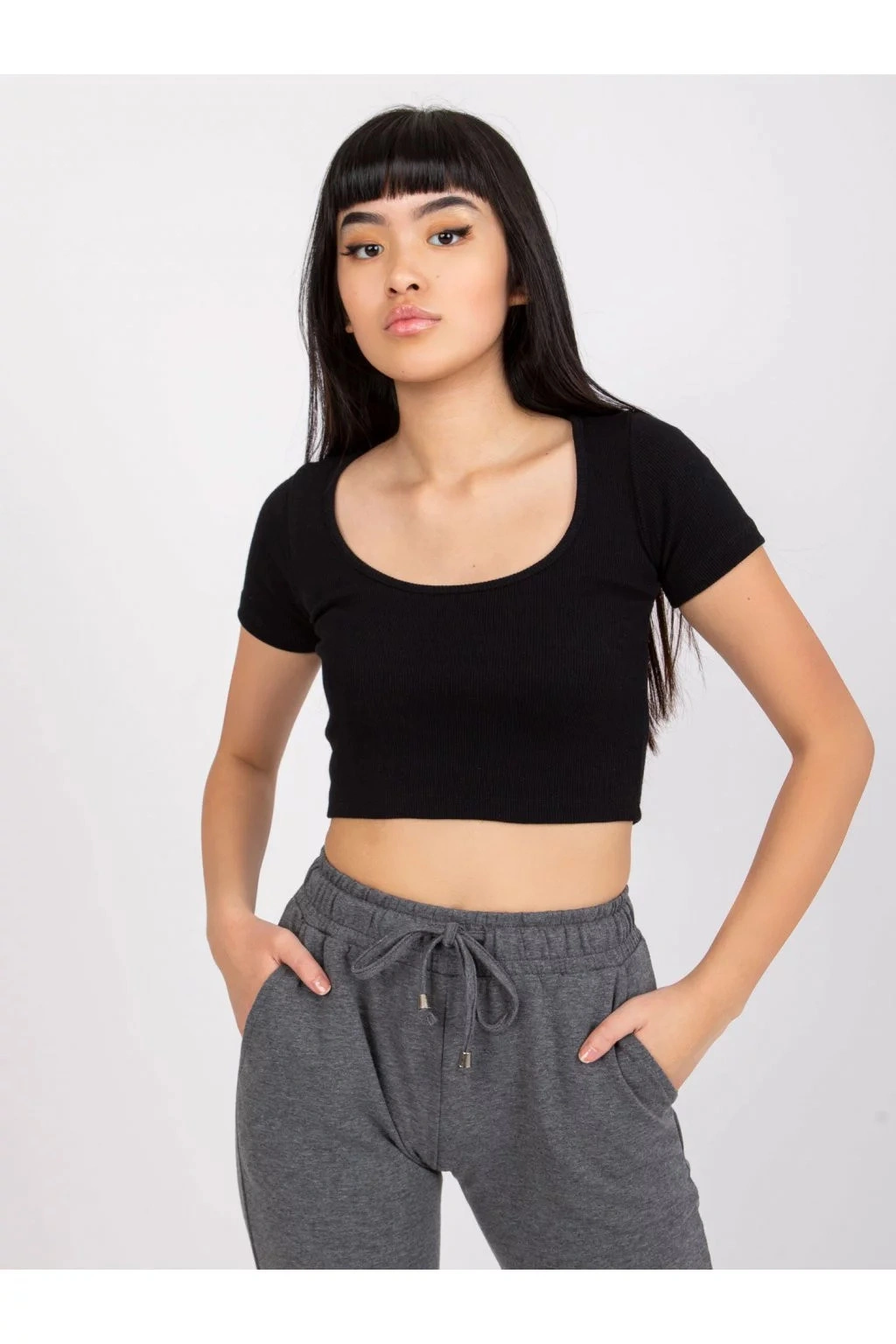Modelka má na sebe veľkosť S. Rozmery modelky: výška 168 cm, prsia 82 cm, pás 62 cm, boky 93 cm.