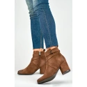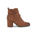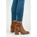 Čižmy z ekologickej semišovej kože. Zapínanie na zips na vnútornej strane. Upevnené na stredne vysokom podpätku. Ozdobné prekrížené remienky s kovovou prackou okolo členku. Zľahka zateplené na vnútornej strane. Pohodlné, klasické a veľmi elegantné čižmy doplnia mnohé jesenné štýly.