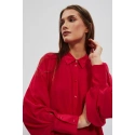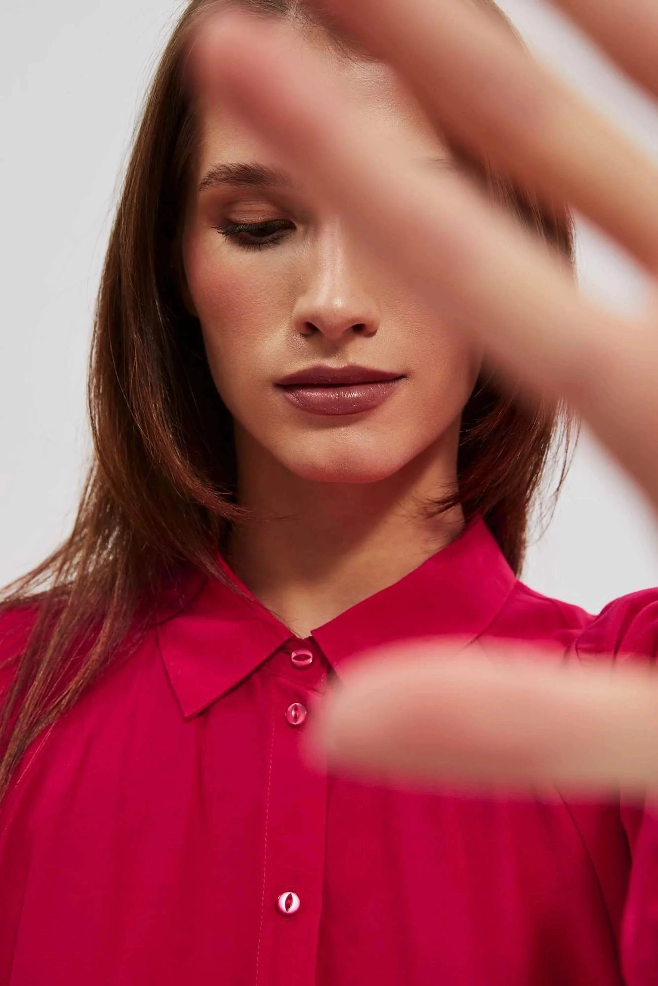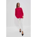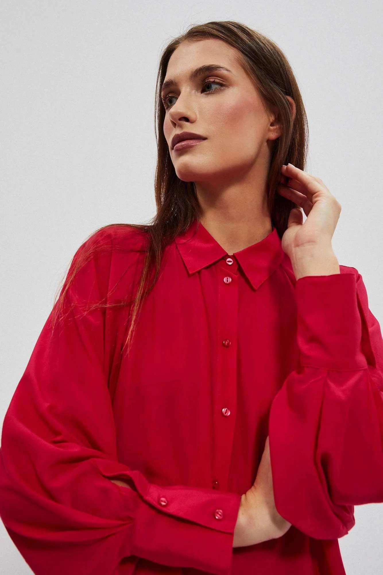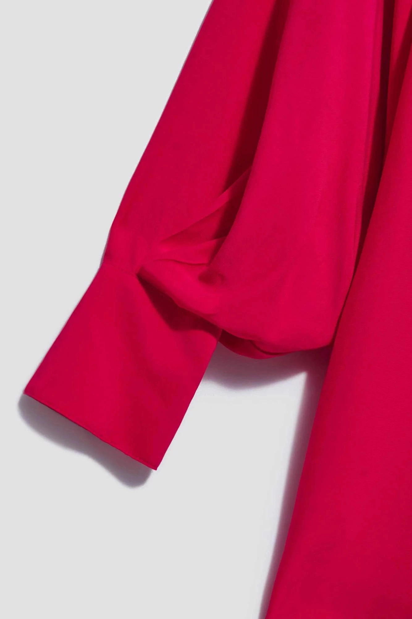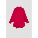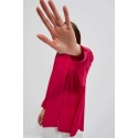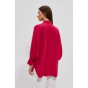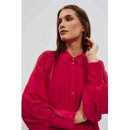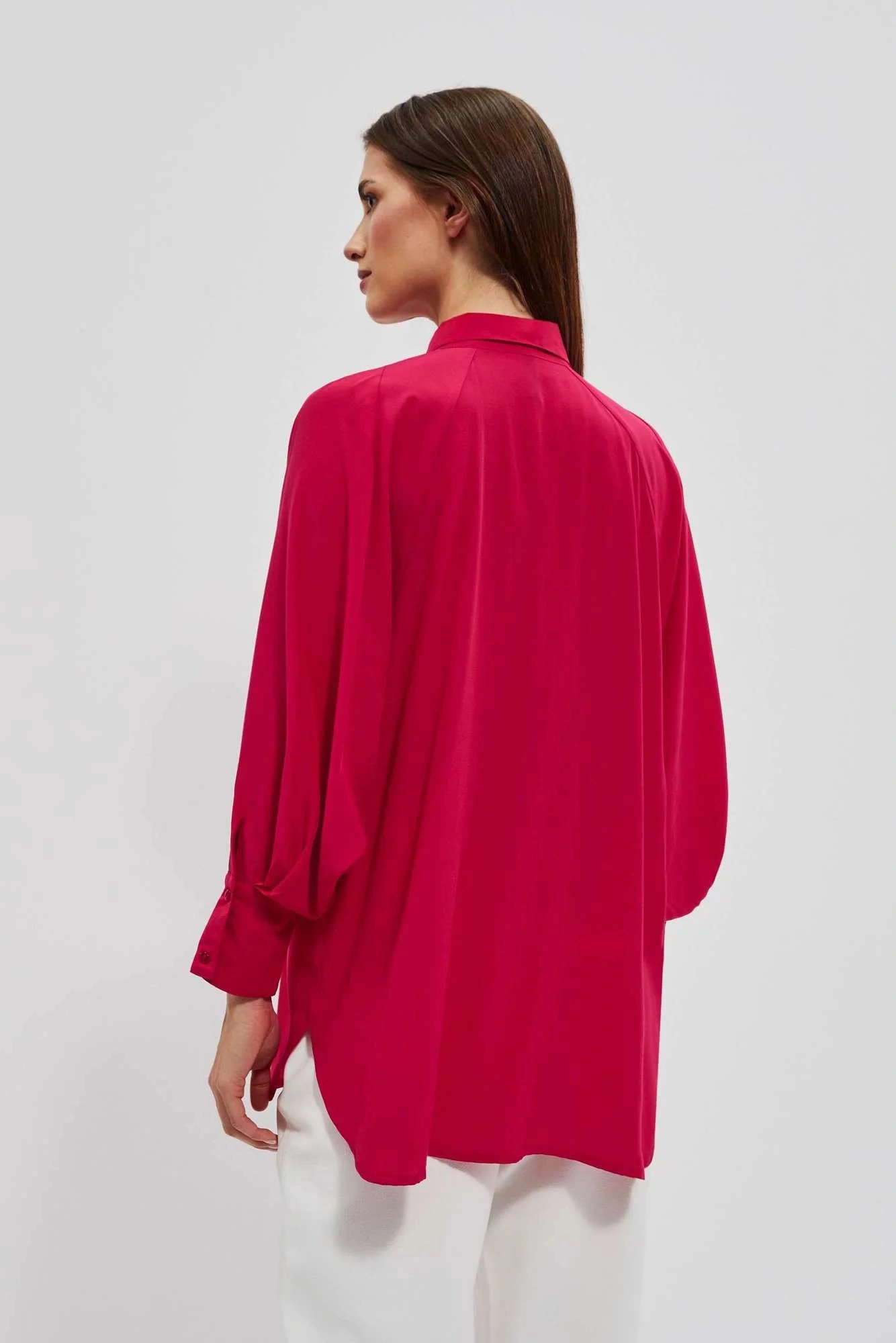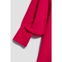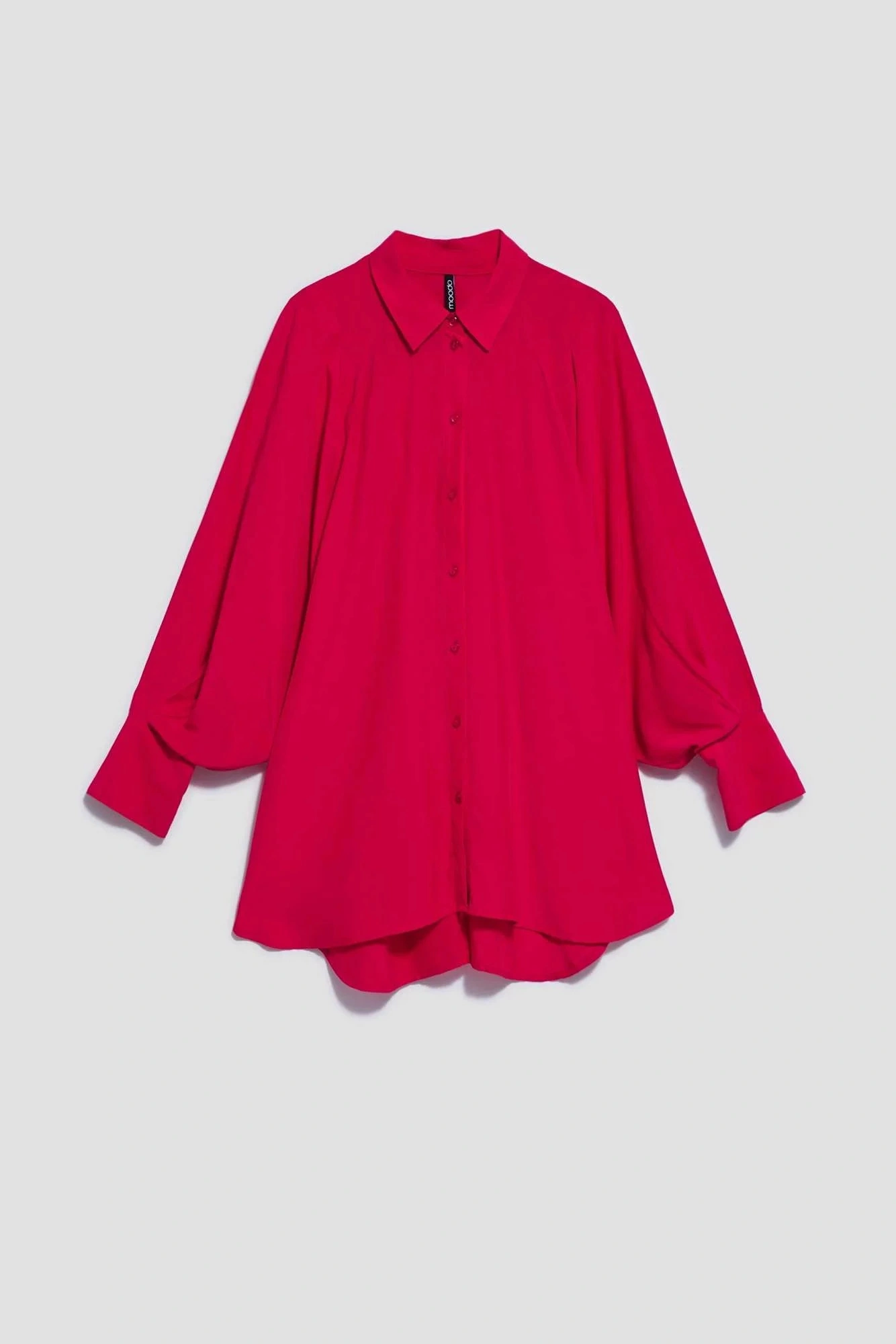 80% POLYESTER, 17% BAVLNA, 3% ELASTAN Elegantná košeľa s dlhými, širokými, nadýchanými rukávmi. Rukávy sú zakončené volánmi a širokými manžetami s dvoma malými gombíkmi. Vyrobená v tmavoružovej farbe. Klasický sťahovací golier s gombíkom. Mierne rozšírená splývavá látka v spodnej časti vytvára krásny tvar písmena A. Hladký materiál, bez vzoru. Oversize strih a dlhší strih dokonale vyhovuje každej postave. Ľahká a pohodlná na nosenie.