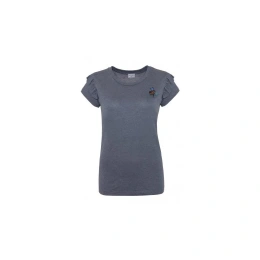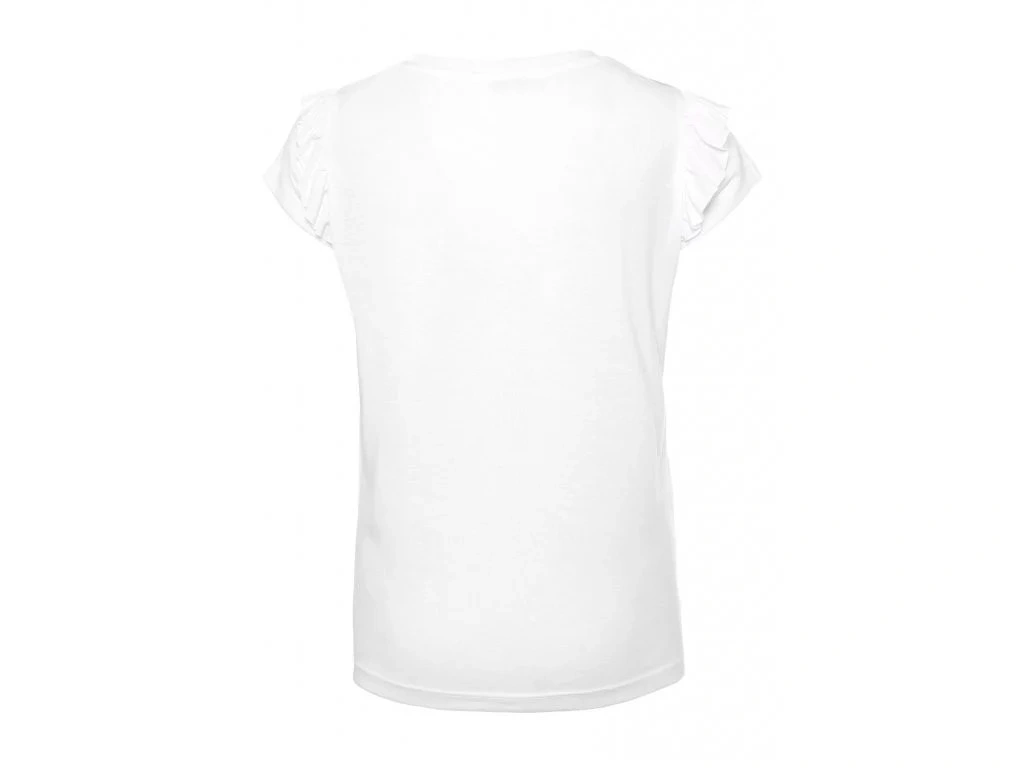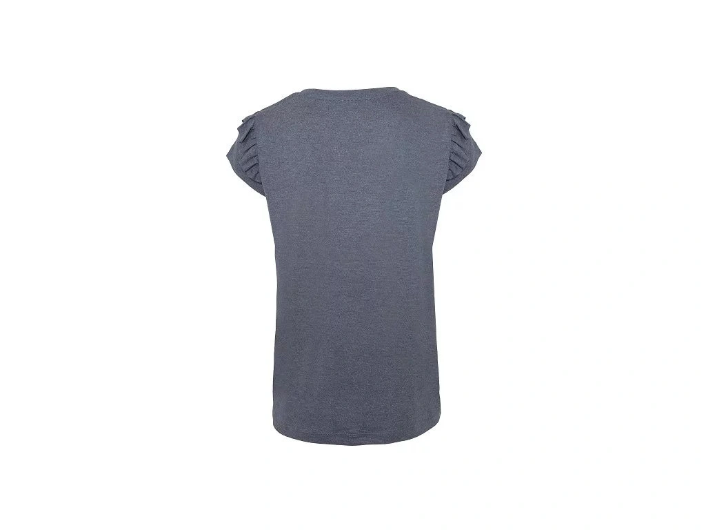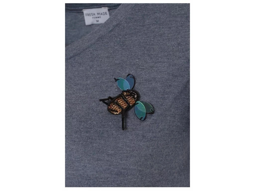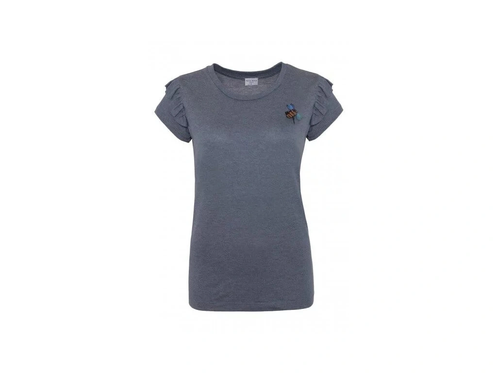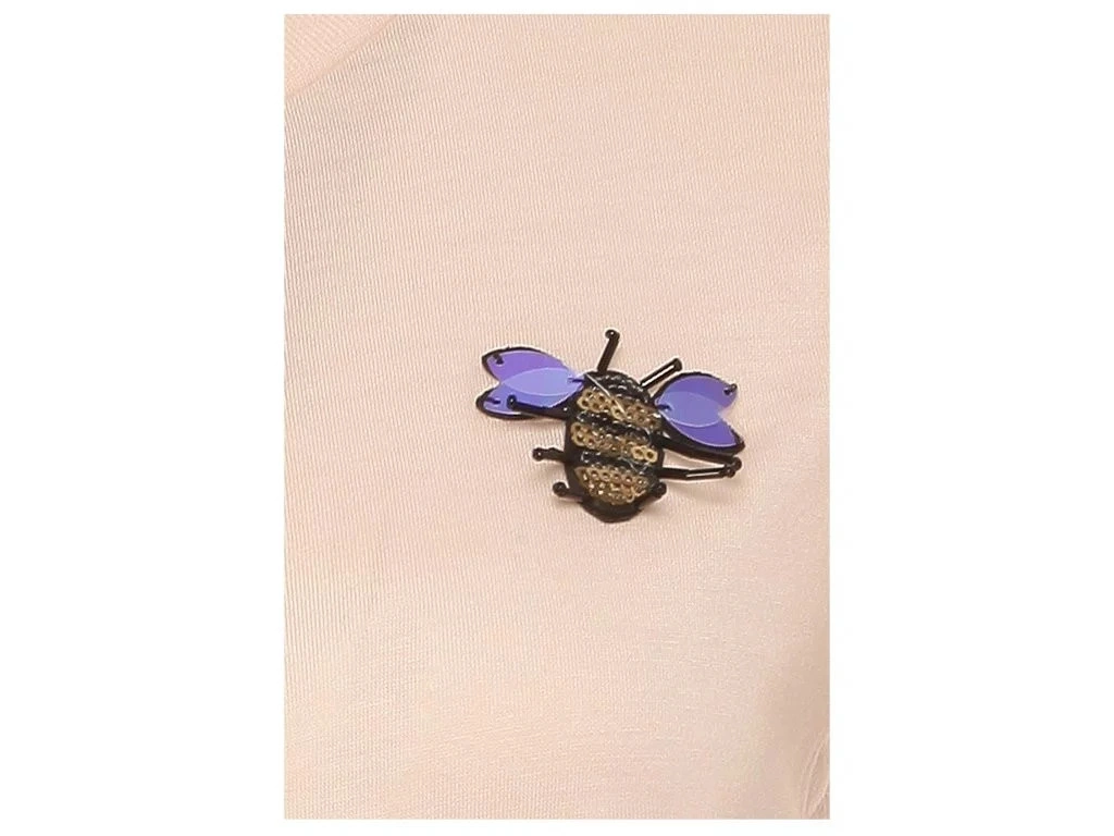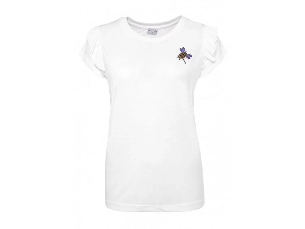 - dámske tričko s volánikmi, ktoré na hrudi zdobí ozdoba s motívom včely vyrobené z korálok a flitrov,