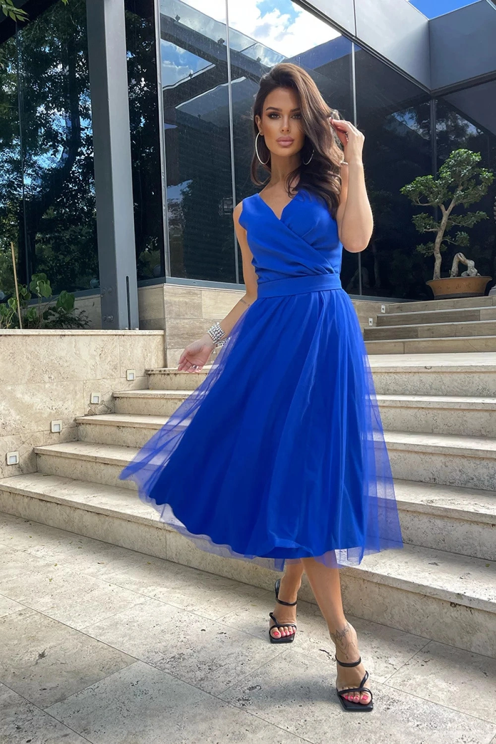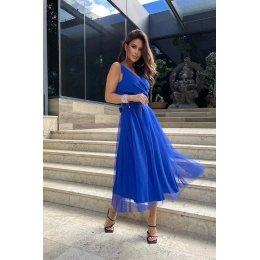 Tylové midi šaty s mierne rozšírenou vrstvenou sukňou. Vrchná časť výtvoru na silnejších popruhoch, dokonale priliehajúca k pásu. Ramená a chrbát sú odhalené. Model dodávajúci eleganciu a ženskosť. Šaty sú podšité a zapínajú sa na krytý zips. K dispozícii v rôznych farbách.