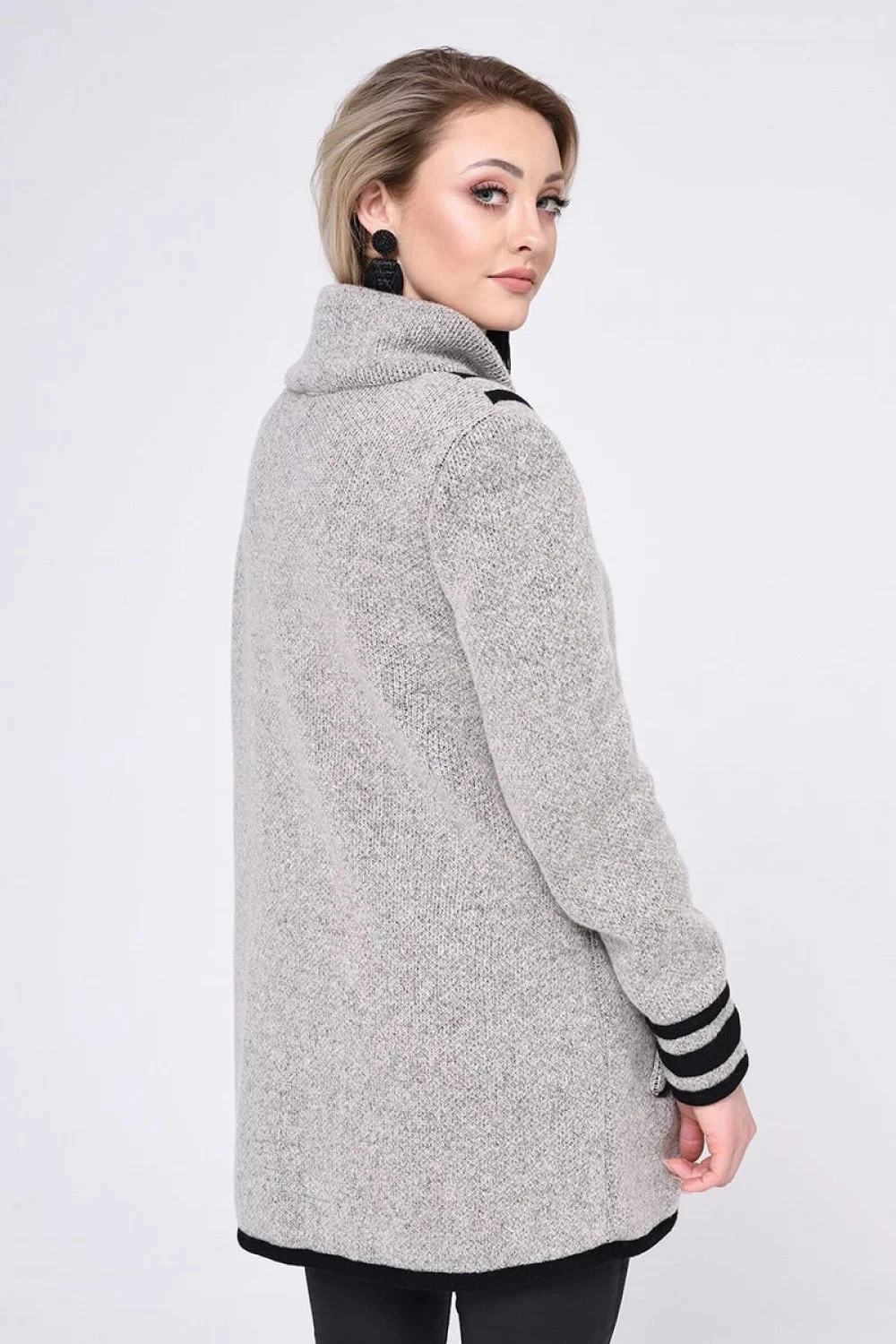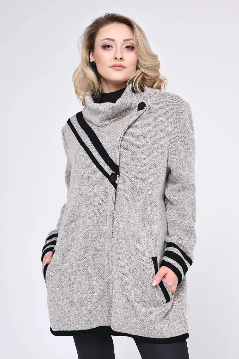 Pletený kabát so zaujímavou štruktúrou a veľkými vreckami. Je ľahká, teplá a pohodlná a je ideálnym