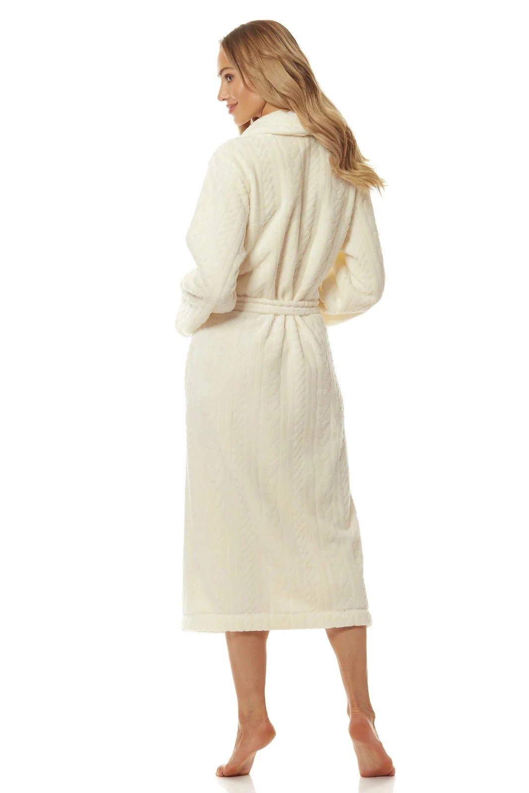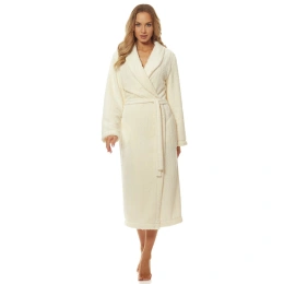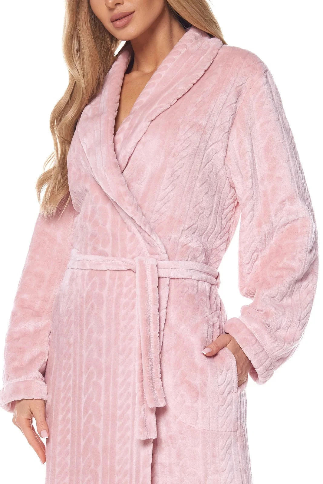 Pohodlný dlhý dámsky župan, ktorý je vyrobený z mäkkej tkaniny typu "soft". Má šálový golier, saténo