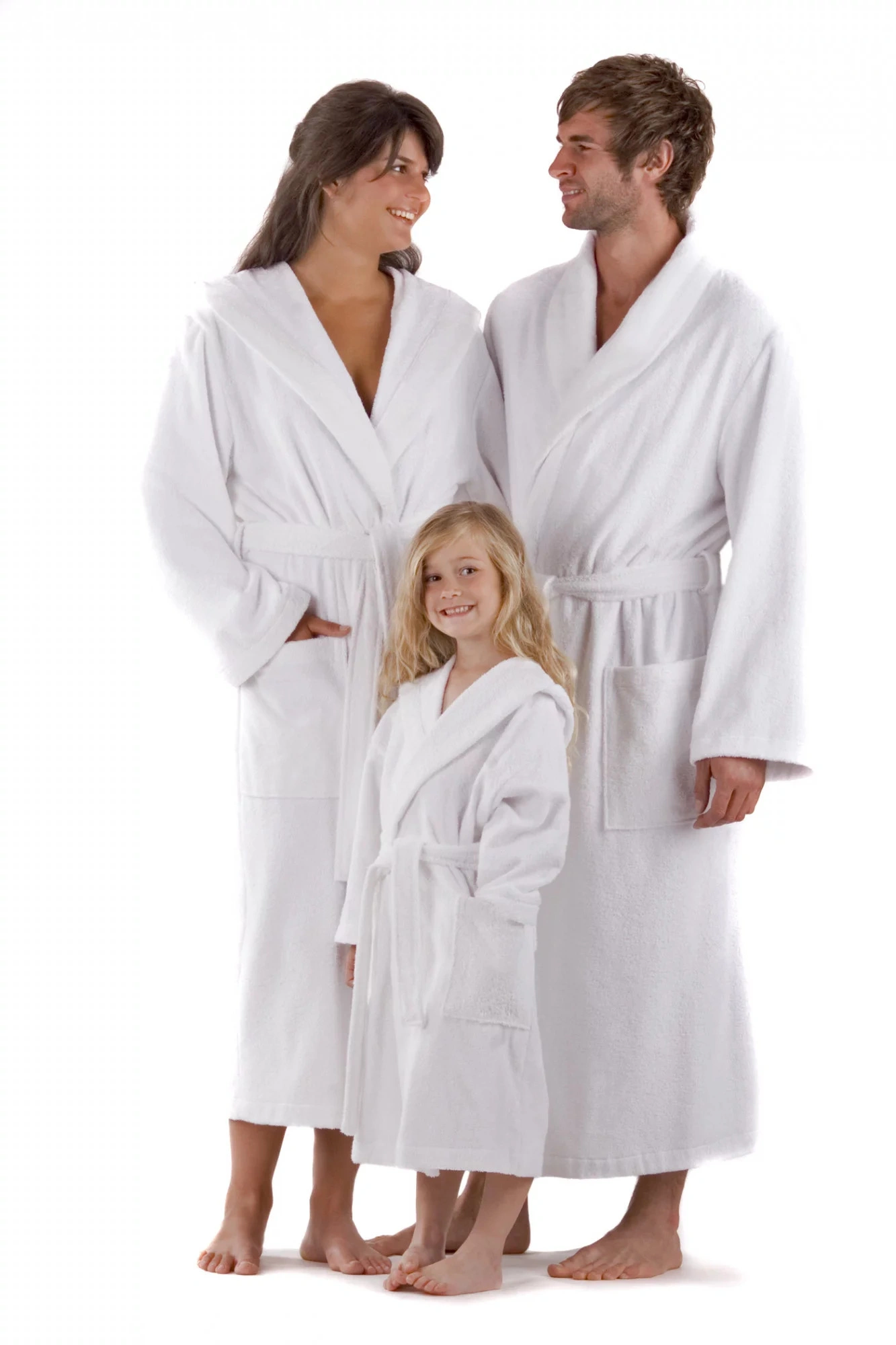 Dlhý biely župan so šálovým golierom je k dispozícii ako unisex model a v tejto kolekcii Sauna si ho môžete zakúpiť aj ako župan s kapucňou, kimonový strih a ako detský župan s kapucňou. Môžete tak zmieriť celú rodinu.