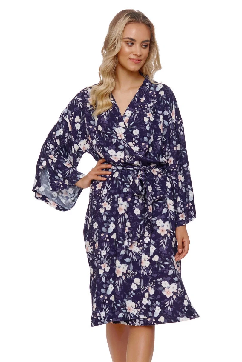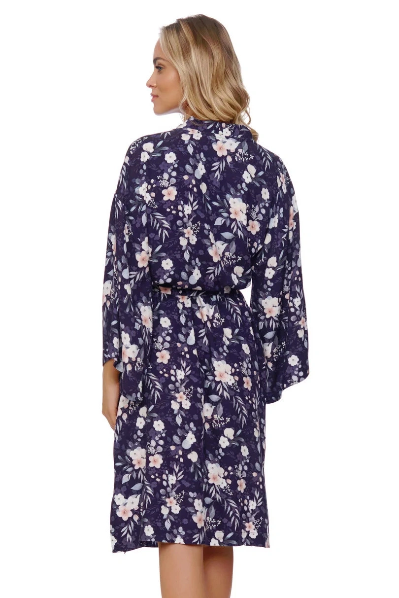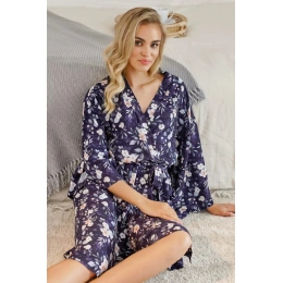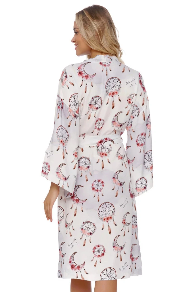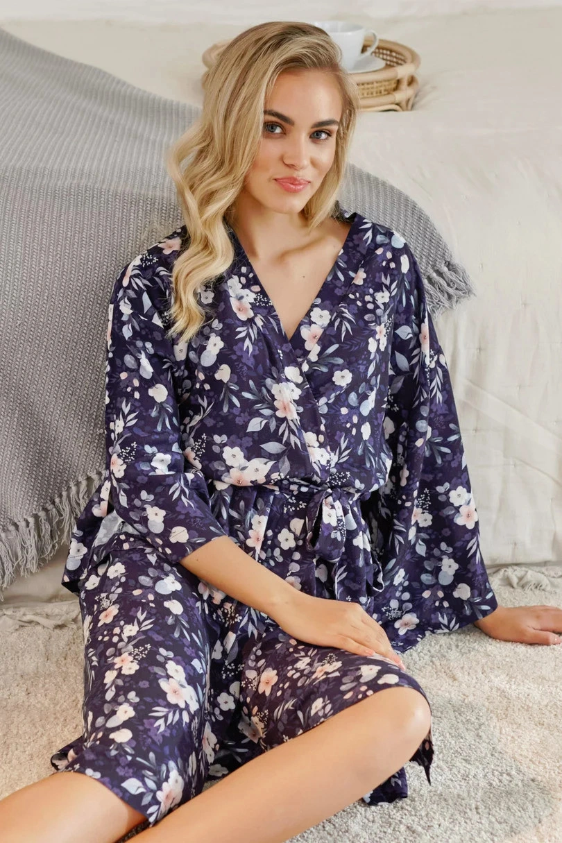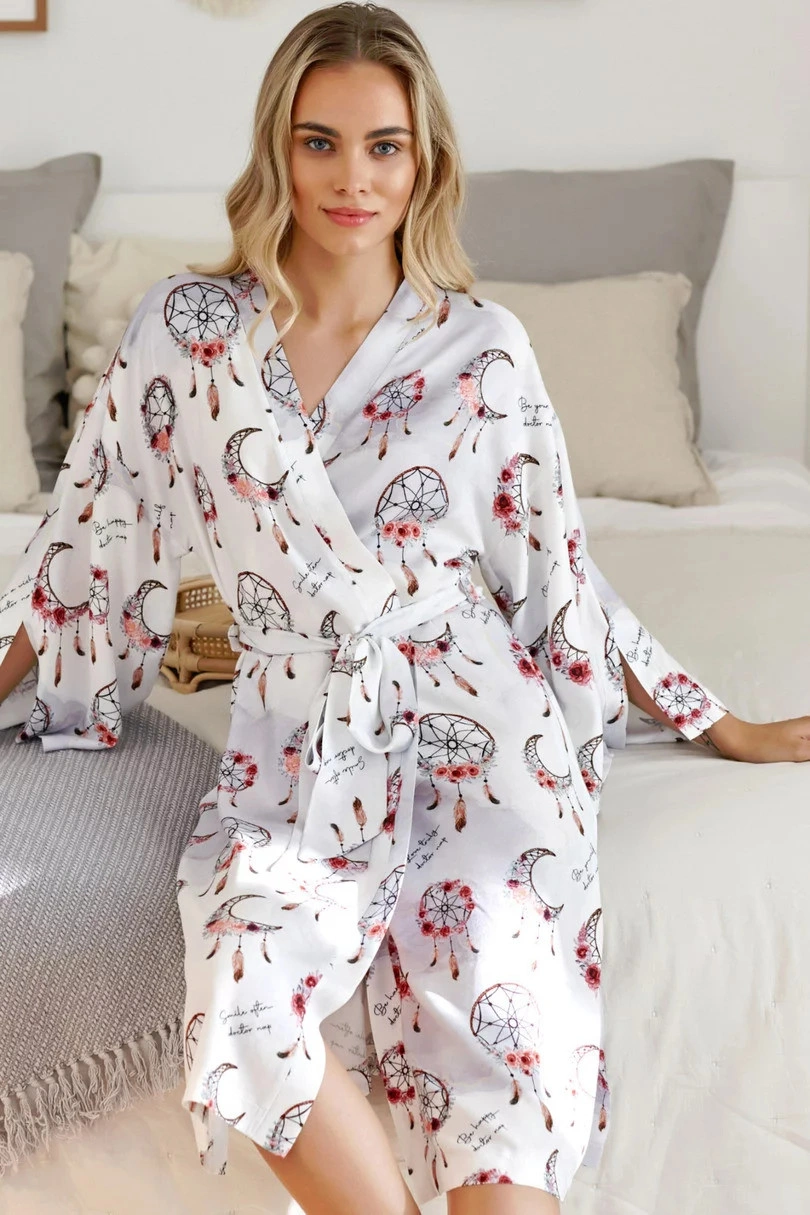 Bambusový župan s krásnym vzorom uviazaný v páse. V štýle HOMEWEAR, ideálny pri relaxácii ako pohodlné domáce oblečenie, na pláž, na letné večery, vyrobené z bambusovej viskózy najvyššej kvality. Nádherný ženský strih s opaskom v páse a jemnými rázporkami na rukávoch.
