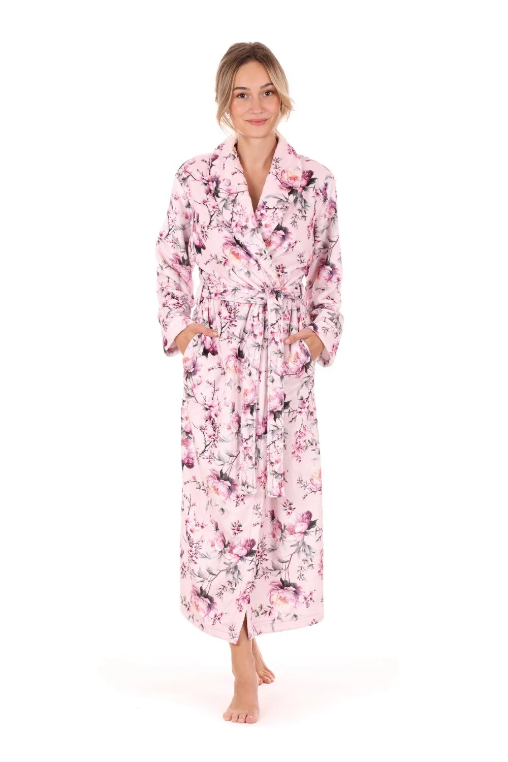 Každý detail jemného kvetinového vzoru ružového dámskeho županu Toya rozpráva príbeh rozkvitnutej jarnej záhrady, v ktorej vôňa kvetov tancuje v ľahkom vánku.