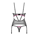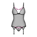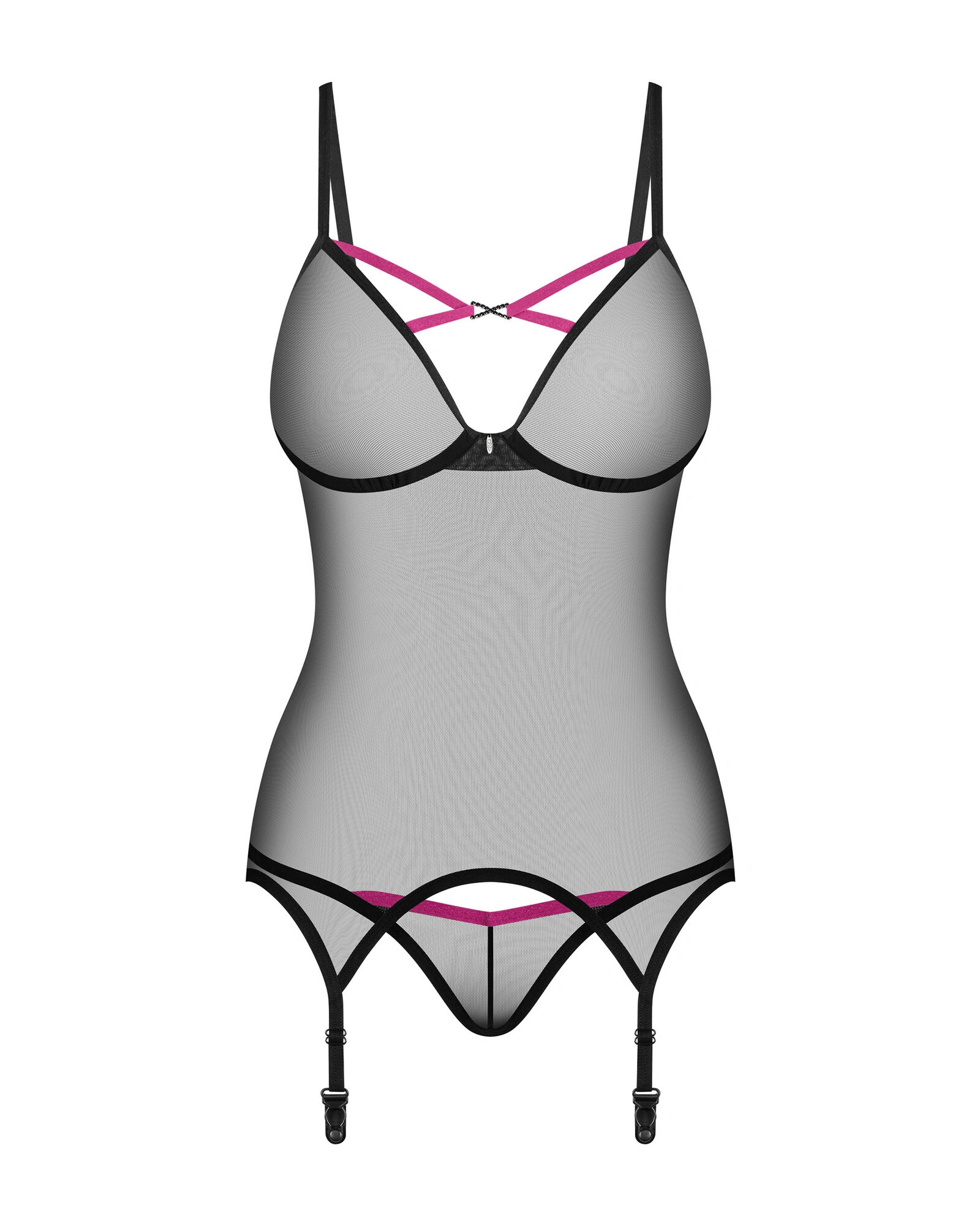 Jemná spodná bielizeň, ktorá zvádza zaujímavými detailmi! Čierny korzet a tangá z kolekcie Novenes jemne obopínajú ženské telo. Vďaka tejto mimoriadne príjemnej priehľadnej tkanine, lesklému prívesku medzi prsiami, farebným ramienkam a integrovaným podväzkovým pásom budete stredobodom pozornosti počas celej noci.