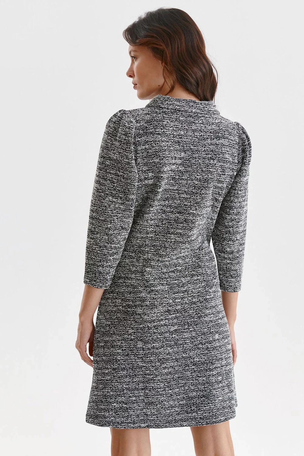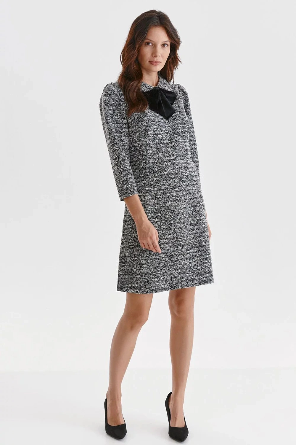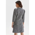 Šaty sú nesmierne očarujúce a plné vznešeného šarmu, majú voľný strih, mierne leštené rukávy v 3/4 dĺžke, BB golier s elegantným zaväzovaním vpredu a sú vyrobené z veľmi príjemného na dotyk a mäkkého úpletu s prímesou metalizovanej priadze. Šaty vo fitted strihu sa skvele hodia k rôznym pracovným aj spoločenským outfitom.