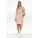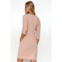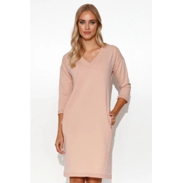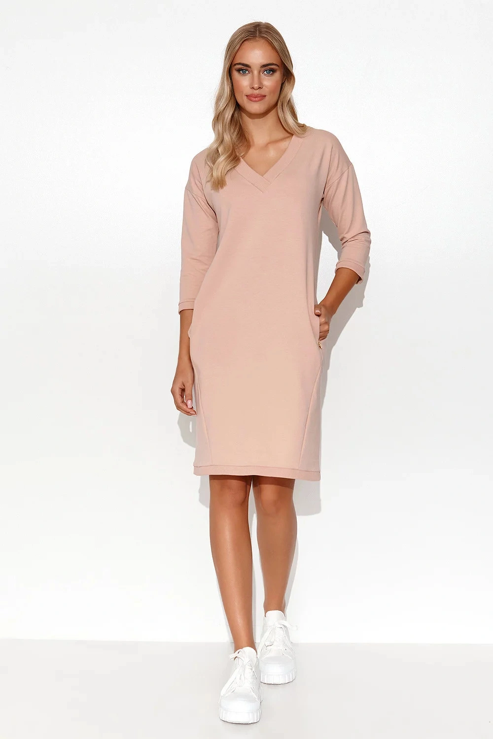 Tieto mikinové šaty majú jednoduchý, ležérny strih, hlboký výstrih do V, 3/4 rukávy a praktické bočné vrecká, z ktorých jedno má našitý ozdobný zlatý štítok. Šaty majú rebrované lemy, ktoré im dodávajú športový nádych. Zadná časť šiat je hladká, so skrytým švom umiestneným v strede. Ideálna letná voľba, ktorú môžete nosiť s ľahkými teniskami alebo športovými sandálmi na aktívny deň.