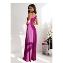 Dlhé rovné šaty s asymetrickými ramienkami, jedným tenkým, druhým hrubším. Šaty sú v páse prestrihnuté, spodná časť je rozšírená. Šaty sa zapínajú na skrytý zips na boku. Ozdobný rozparok na chrbte s pleteným šnurovaním.