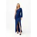 Tieto asymetrické šaty na jedno rameno s rukávmi sú vyrobené z trblietavej, lesklej látky, ktorá sa na slnku krásne leskne. Maxi šaty majú priliehavý strih, ktorý dokonale sedí na tele, a volánik, ktorý zakryje všetky nedokonalosti. Asymetrické šaty majú rozparok odhaľujúci nohy a jeden dlhý rukáv. Zapínajú sa na krytý zips umiestnený v zadnej časti šiat. Dlhé šaty pôsobia veľmi elegantne, takže sa budú výborne hodiť na veľké udalosti, ako sú svadby, Silvester alebo plesy. Výrobok je vyrobený a ušitý v Poľsku.