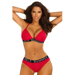 Dvojdielne plavky so športovým strihom. Podprsenka s vystuženými tvarovanými košíčkami. Ramienka uviazané za krkom pre sadu klasických nohavičiek.