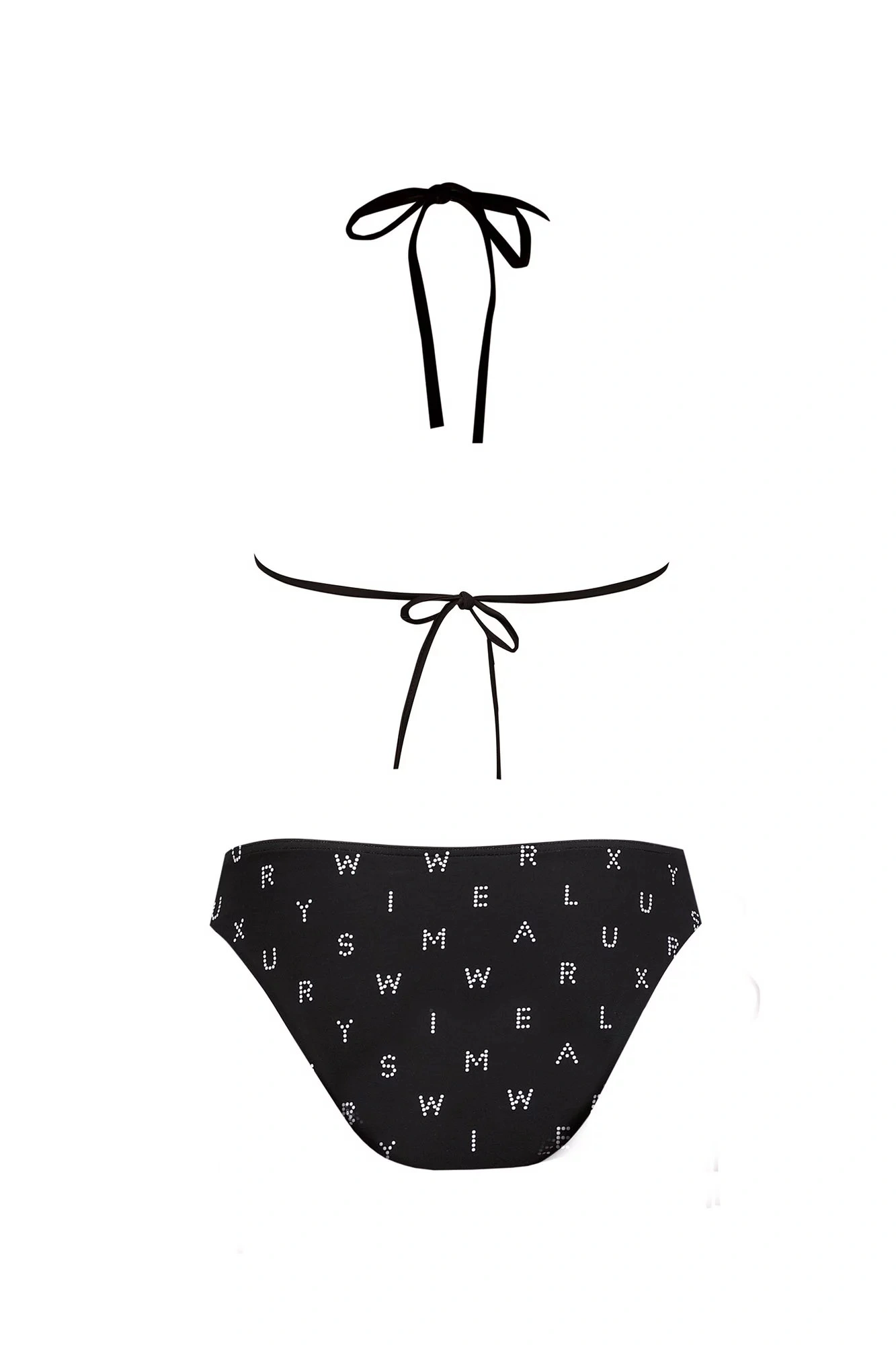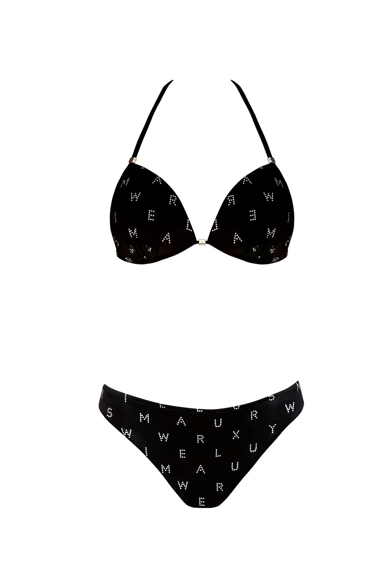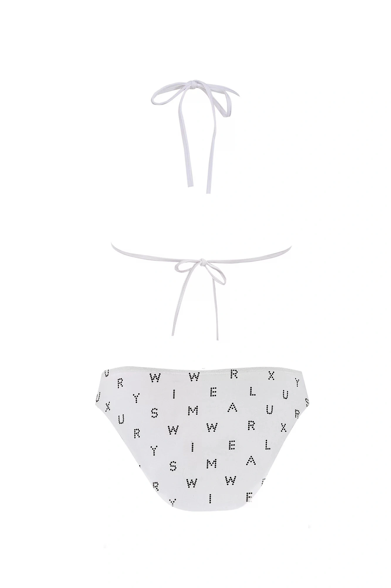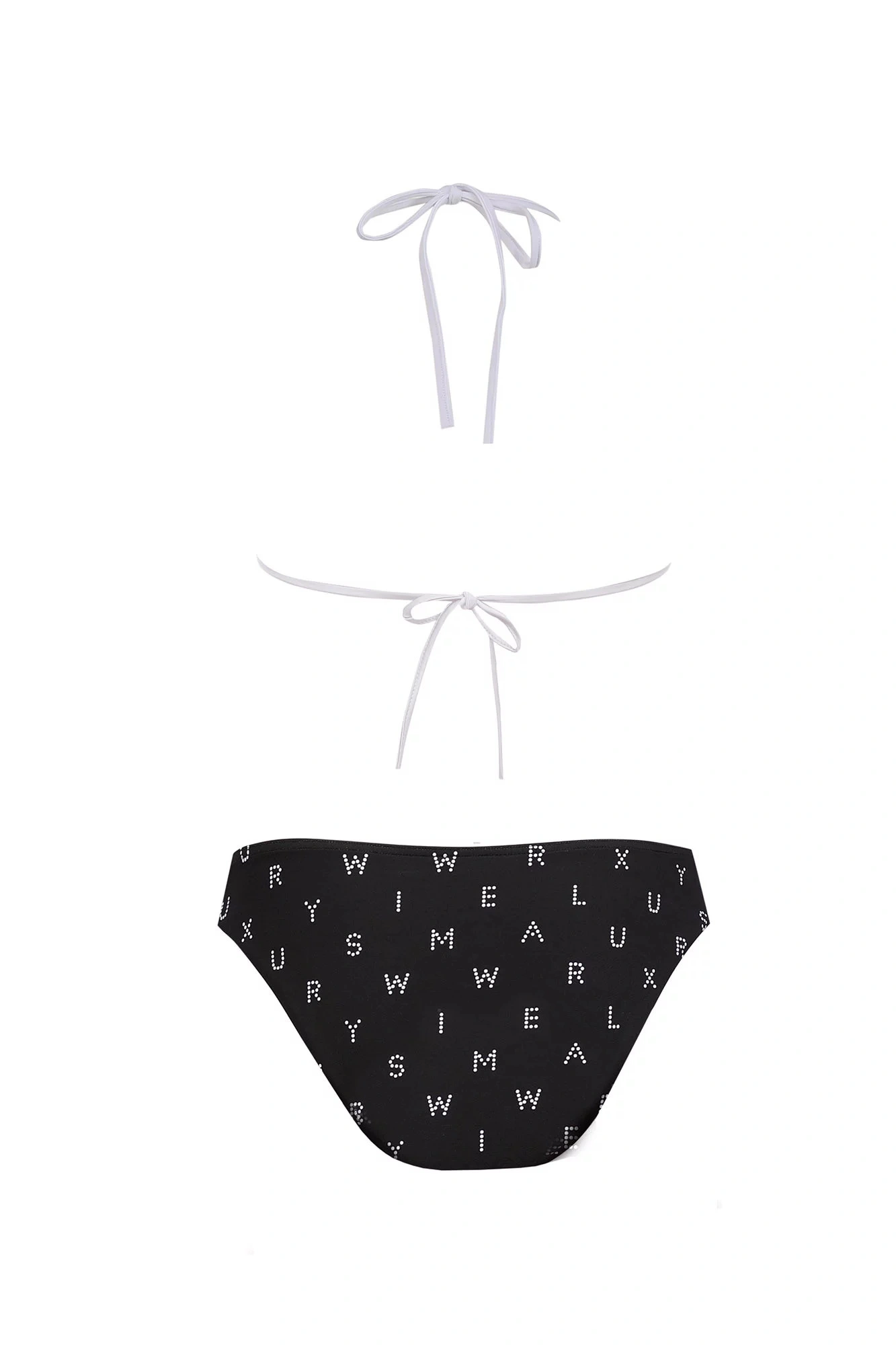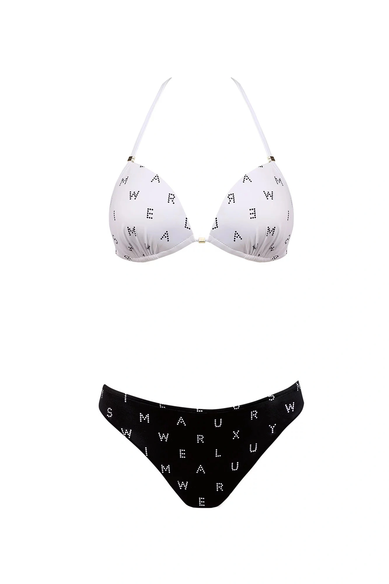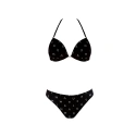 Dvojdielne dámske plavky, vrchný diel mierne vystužený, bez kostice, spodná časť podprsenky na posúvanie. Vzadu na zaväzovanie za krem a na chrbte.