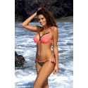 Fenomenálne dvojdielne plavky s módnymi gumičkami vo výstrihu. Podprsenka s kosticami a vystuženými košíčkami približuje prsia k sebe, čo je vidieť na obrázku, a zabudovaná push-up výplň poprsia ešte zväčšuje. Výsledok? Pevný, zvodný výstrih. Ramienka (elastické pásky) sú pružné, so zlatými šperkami a veľmi módne. Dodajú vám skutočný sex-appeal, ktorý si môžete na pláži dovoliť. Nastaviteľné, neodnímateľné ramenné popruhy. Obvodová guma, zapínanie na pracku, odporúča sa aj pre dámy, ktoré nosia úzke podprsenky. Brazílske bikiny s vysokým vykrojením na zadku - sexy a ideálne na opaľovanie. Na dosiahnutie plného brazílskeho efektu by mal byť spodný diel výrazne vytiahnutý smerom k bokom. Pohodlné úväzy na bokoch. P.S. Zadná časť bikín má dodatočný záhyb v látke, ktorý opticky zaguľacuje zadoček.