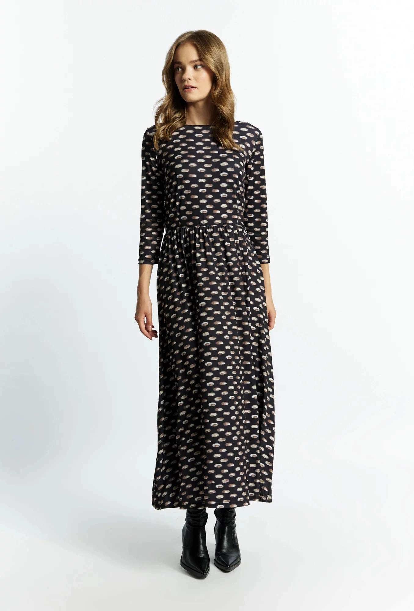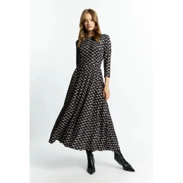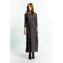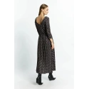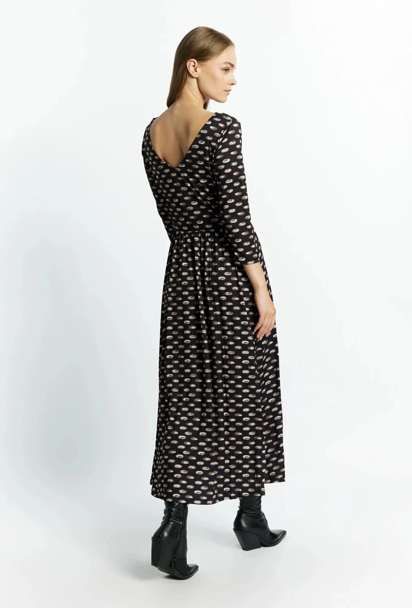 Elegantné dámske šaty z látky príjemnej na dotyk. Šaty s 3/4 rukávmi, polkruhovým výstrihom a opaskom v páse. Šaty sú vzadu zdobené rozparkom. Tento model je určite vhodný na špeciálne príležitosti. Model na obrázku je vysoký 177 cm a má veľkosť 36.