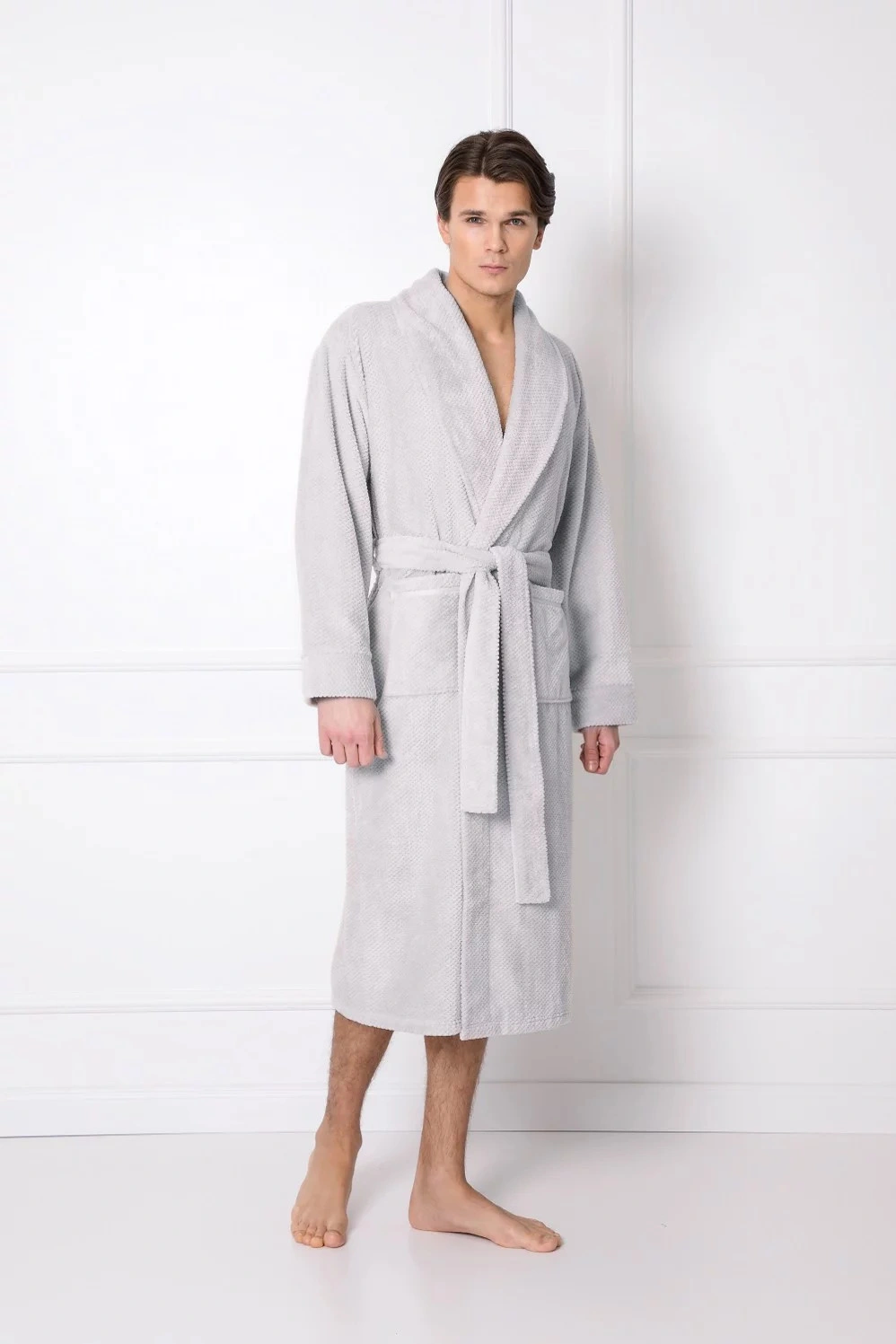 Model má šálový golier, vonkajšie vrecká na bokoch a viazanie v páse. Župan je mäkký a príjemný na dotyk, pohodlný a vhodný na nosenie.