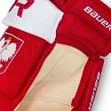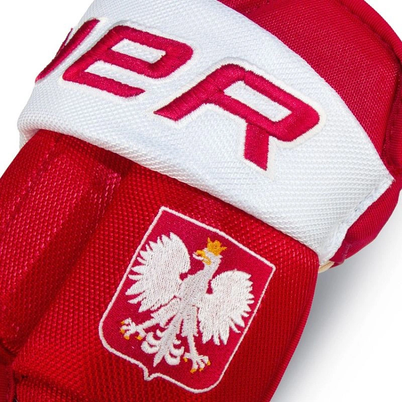 Rękawice hokejowe Bauer Vapor Pro Sr Maksymalna kontrola i profesjonalna ochrona Rękawice hokejowe Bauer Vapor Pro Sr zostały zaprojektowane w barwach narodowych z godłem Polski, co czyni je wyjątkowym wyborem dla zawodników oraz fanów reprezentacji Polski. Model ten łączy sportowe dopasowanie z wysokim poziomem ochrony, oferując doskonałą kontrolę i komfort podczas gry. Zwężony krój Vapor zapewnia większą swobodę ruchu, szczególnie w okolicy nadgarstka, co przekłada się na lepsze czucie kija i precyzję manewrów na lodzie. Główne cechy: Zwężony krój Vapor: Szerszy mankiet i dopasowana konstrukcja zwiększają mobilność nadgarstka i kontrolę. Podwójna pianka + Hyperlite HD + PE: Zaawansowany system ochrony zapewniający wysoki poziom bezpieczeństwa dłoni i palców. Dłoń PRO z mikrozamszu: Dwuwarstwowa konstrukcja gwarantuje trwałość i pewny chwyt kija. Wyściółka Hyper Sense: Zwiększa komfort i dopasowanie w okolicy palców. Technologia ThermoMax: Odprowadza wil