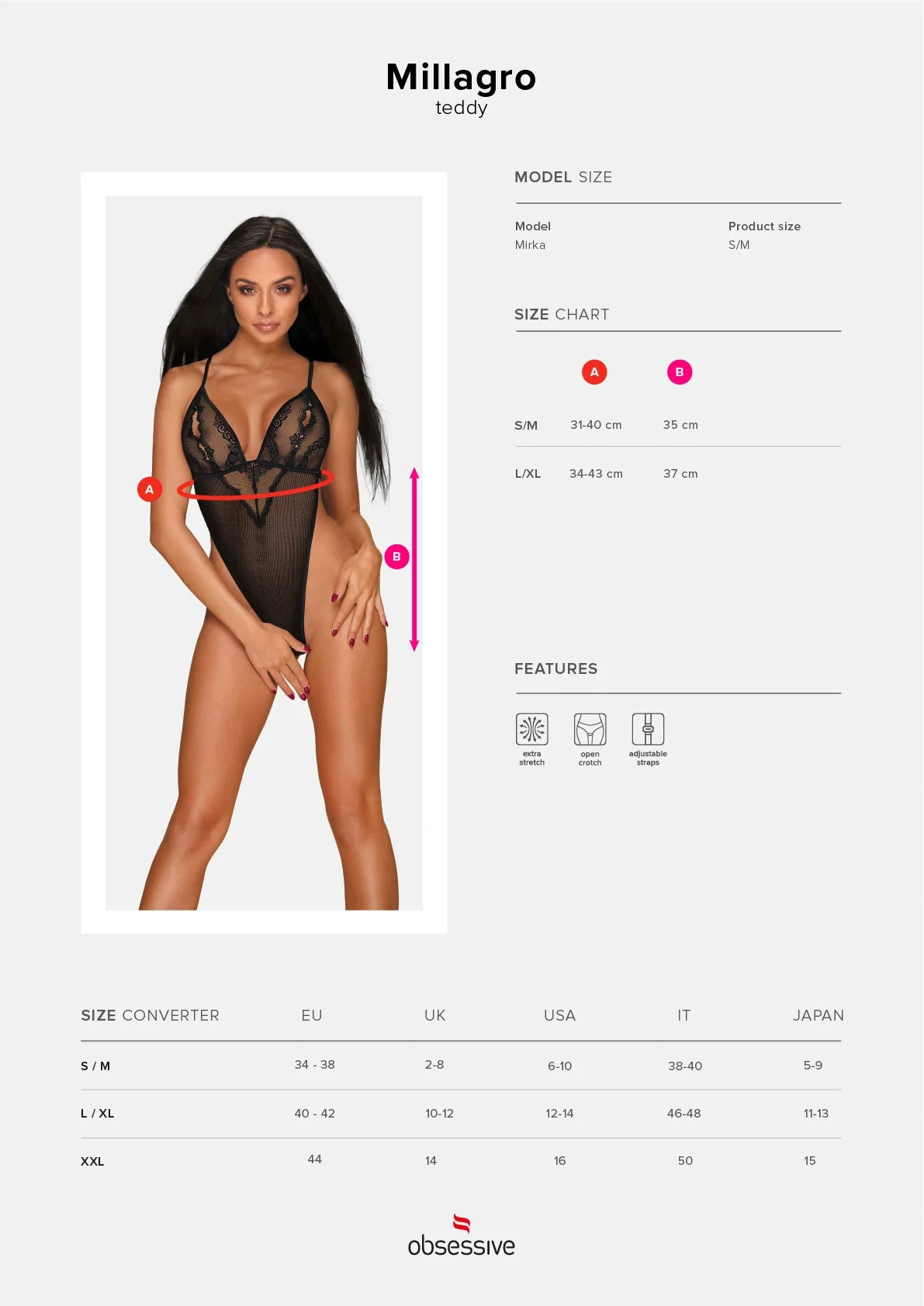 Pozrite sa, koľko lásky môže priniesť správne spodnú bielizeň! Nechajte sa zlákať čipkovými ornamentmi a fantastickým strihom Millagro teddy. Horúca kombinácia čiernej farby a ramienok - elegancia, trocha pikantnosti a ženskosti. Malé prestrihy na prsiach dodávajú štýl a super sexy ramienka na chrbte podnecujú fantáziu!