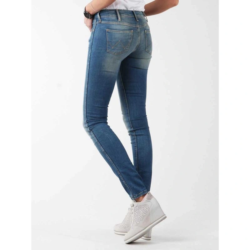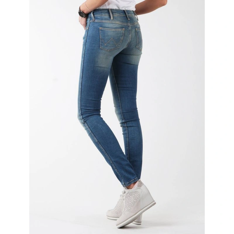 Dámske džínsy so zúženými nohavicami. Vrecká na prednej a zadnej strane. Kožená vložka s logom Wrangler na zadnej strane. Nohavice sú priliehavé, elastické a obopínajú postavu.