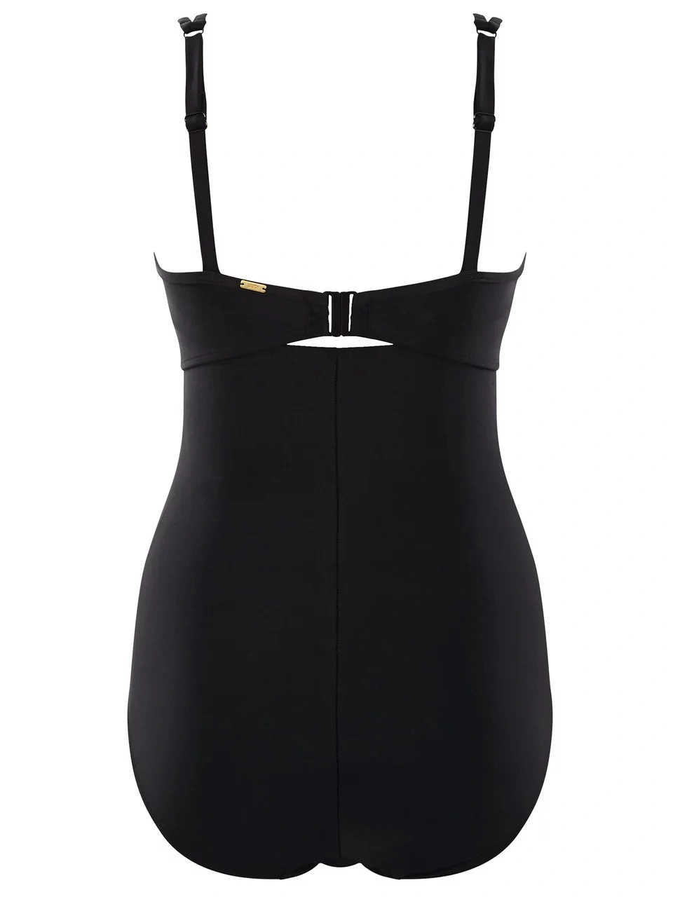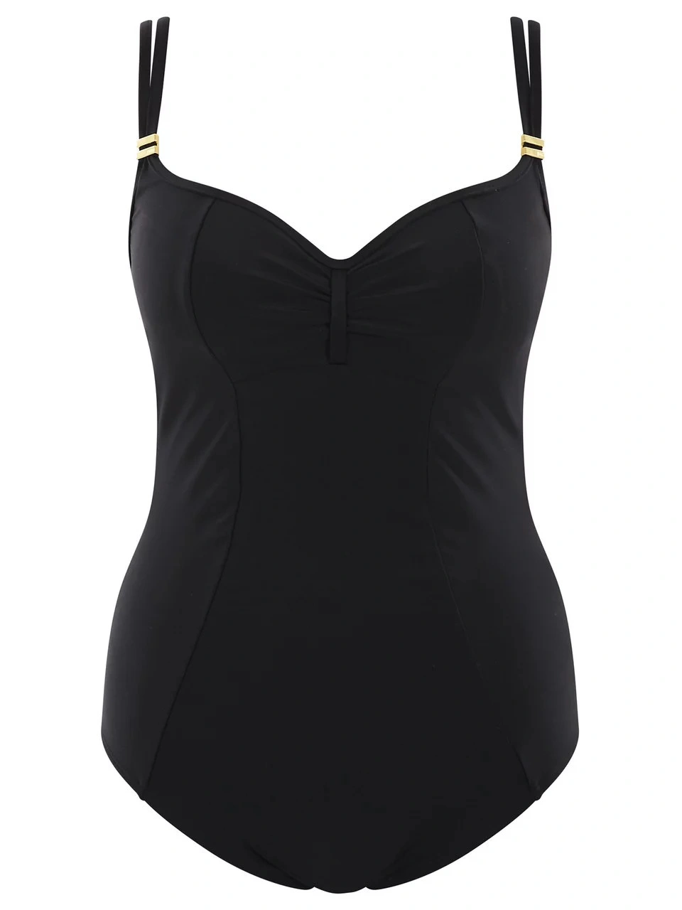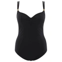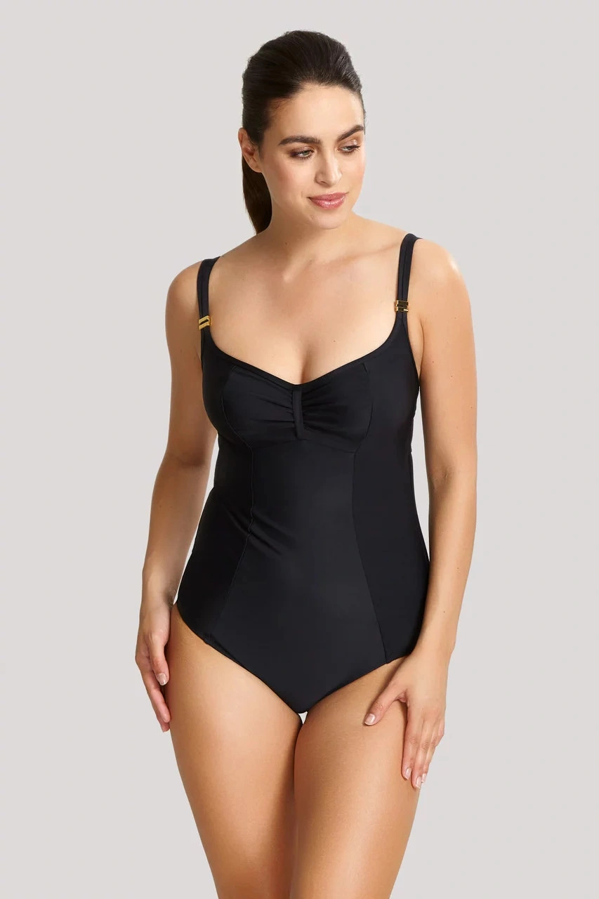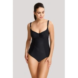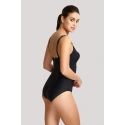 Jednodielne dámske plavky. Nevyztužená podprsenka s kosticami, ramienka na posúvanie, chrbát len mierne vykrojený, zaistený ďalším hrubým zapínaním na chrbte.