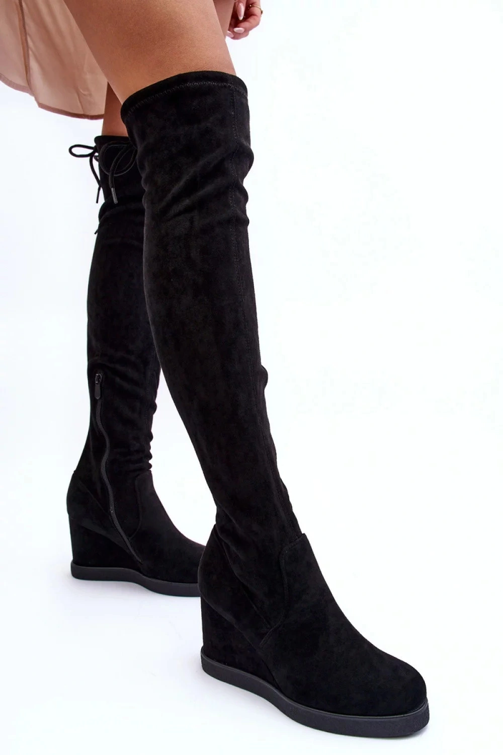 Dámske topánky so šnurovacím zvrškom nad kolenom. Nazúvací model, s dodatočným zipsom na boku zvršku. Stojí na platforme a podpätku. Zateplenie vo výške chodidla. Päta je vystužená. Tento jedinečný strih poteší každého!