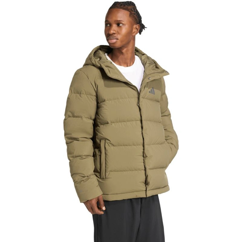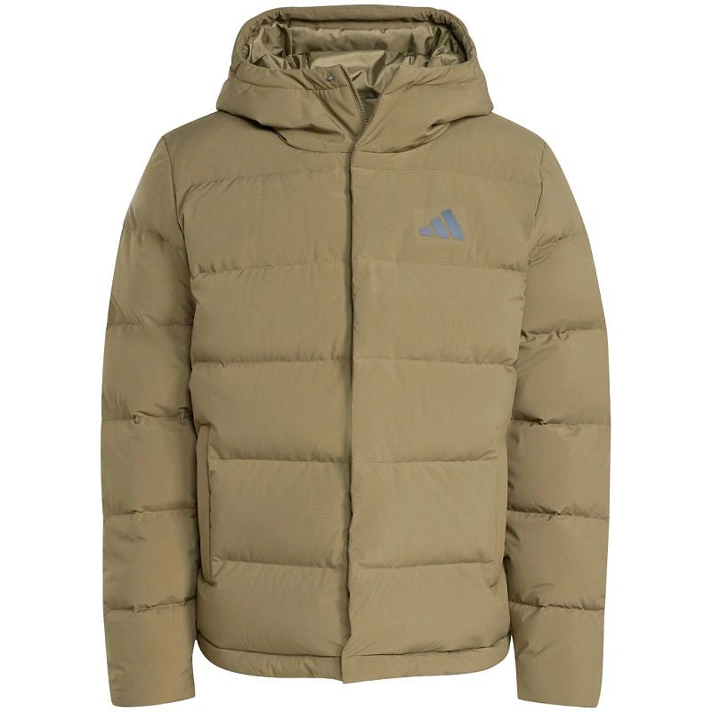 Pánska mikina adidas Helionic Climawarm Hoodie Olive JX0580 Táto pánska bunda adidas vytvára izoláciu pred chladom vďaka prírodnej výplni, ktorá je zapuzdrená v horizontálnych paneloch. regular strih so skrytými elastickými manžetami. stojačik. zapínanie na patentky a neodnímateľná kapucňa. zips po celej dĺžke. bočné vrecká na zips. decentné logo značky. technické údaje:- hlavná tkanina: 100% recyklovaný polyester- výplň: 80% kačacie páperie, 20% perie.