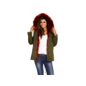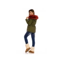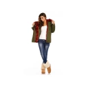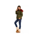 Dámska zimná bunda v khaki farbe s vínovou vložkou a kožušinou, ktorá je odopínacia na zips.Oteplená vložka sa dá tiež vybrať, takže je možné používať bundu aj na prechodné obdobie. Bunda má dve bočné zapínateľné vrecká. V páse šnúrka na sťahovanie.
