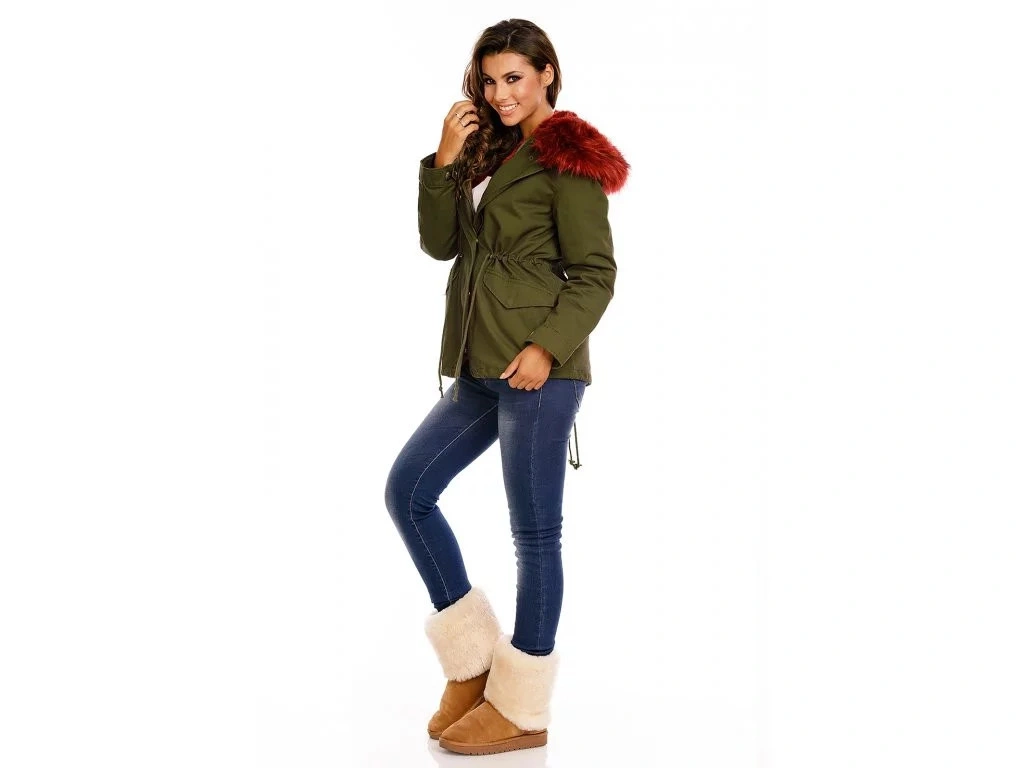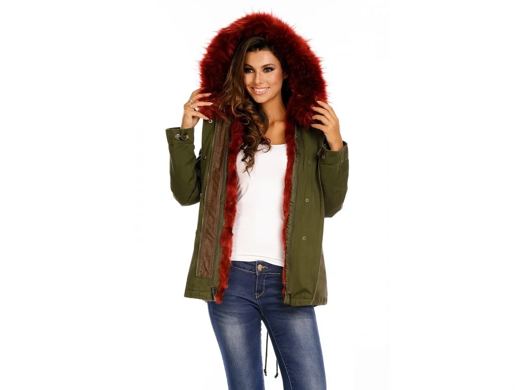 Dámska zimná bunda v khaki farbe s vínovou vložkou a kožušinou, ktorá je odopínacia na zips.Oteplená vložka sa dá tiež vybrať, takže je možné používať bundu aj na prechodné obdobie. Bunda má dve bočné zapínateľné vrecká. V páse šnúrka na sťahovanie.
