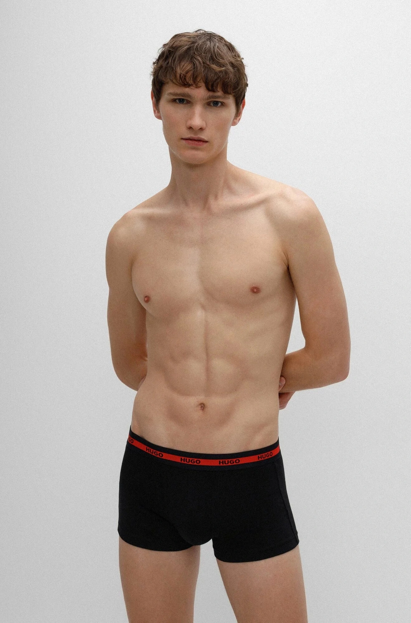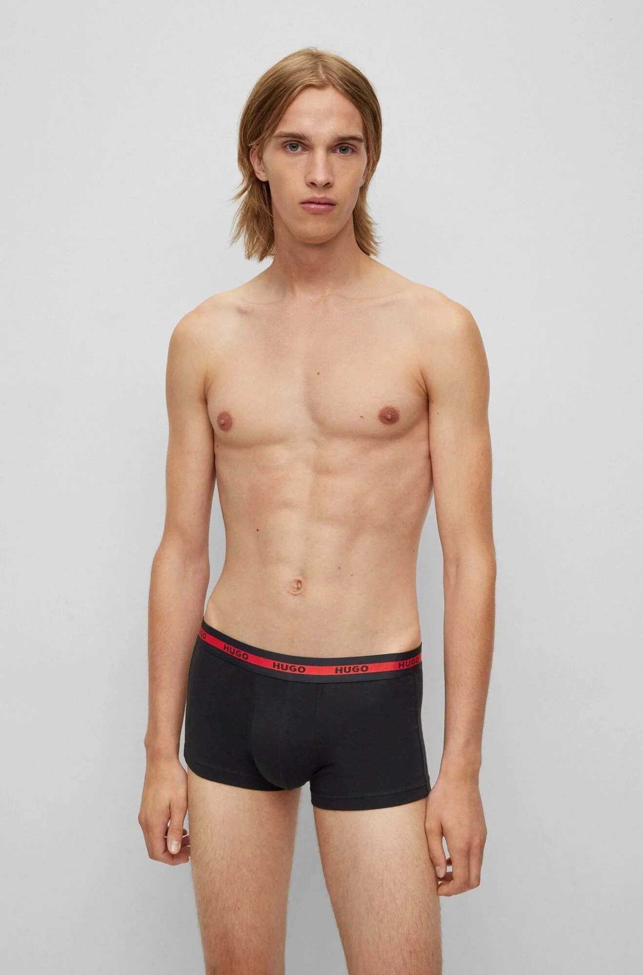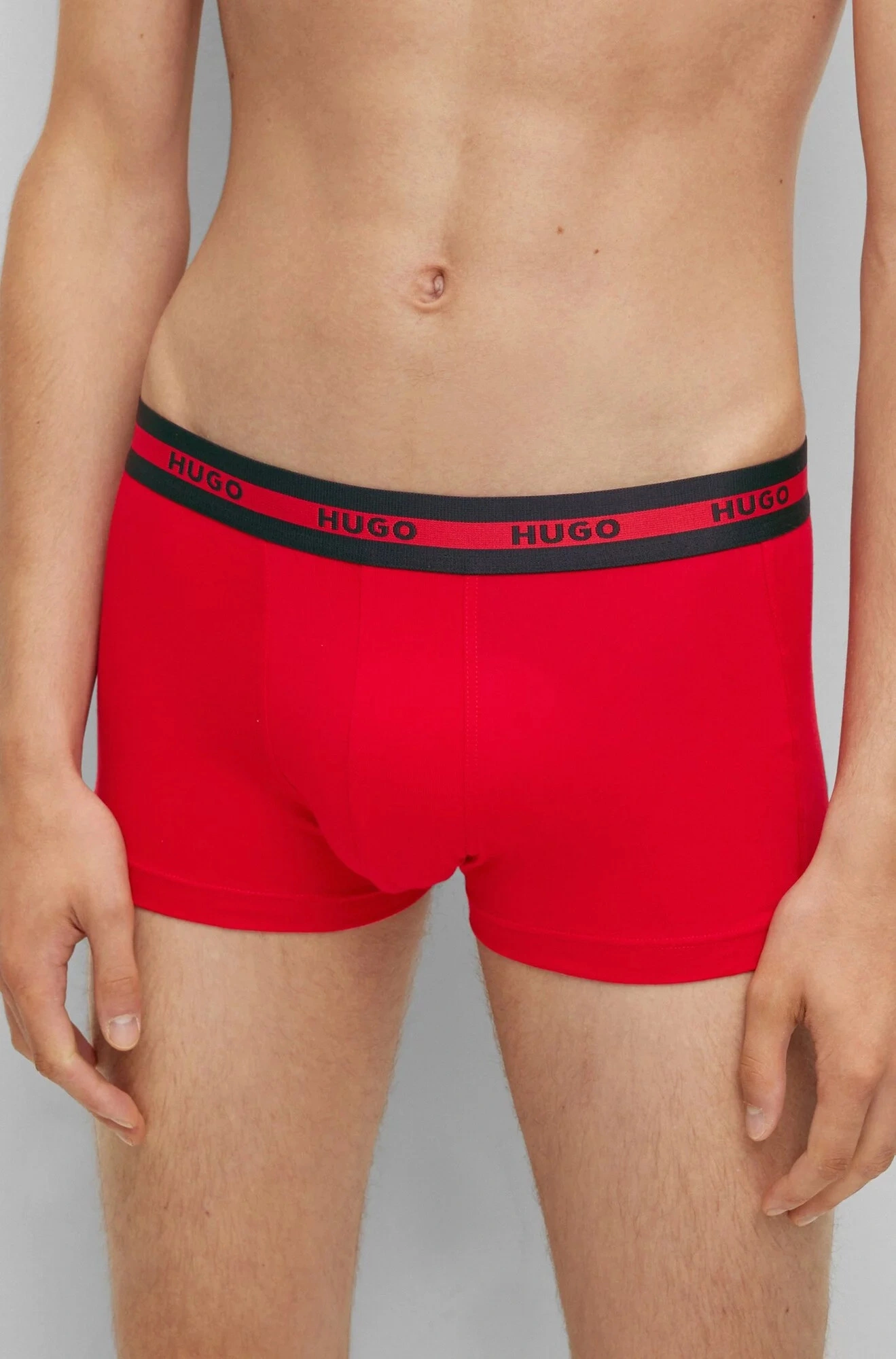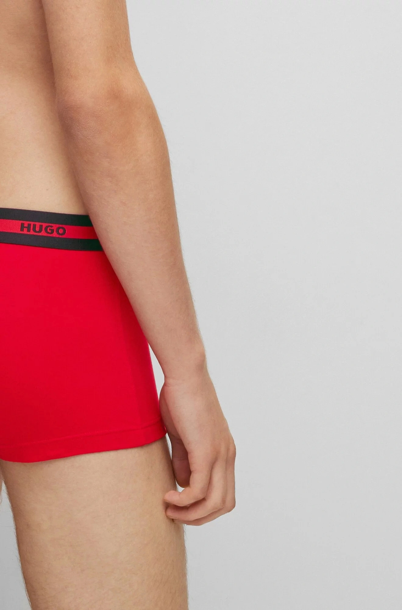 - odhalený pás zdobia logá HUGO na červenom pruhu, ktoré dotvárajú DNA značky.