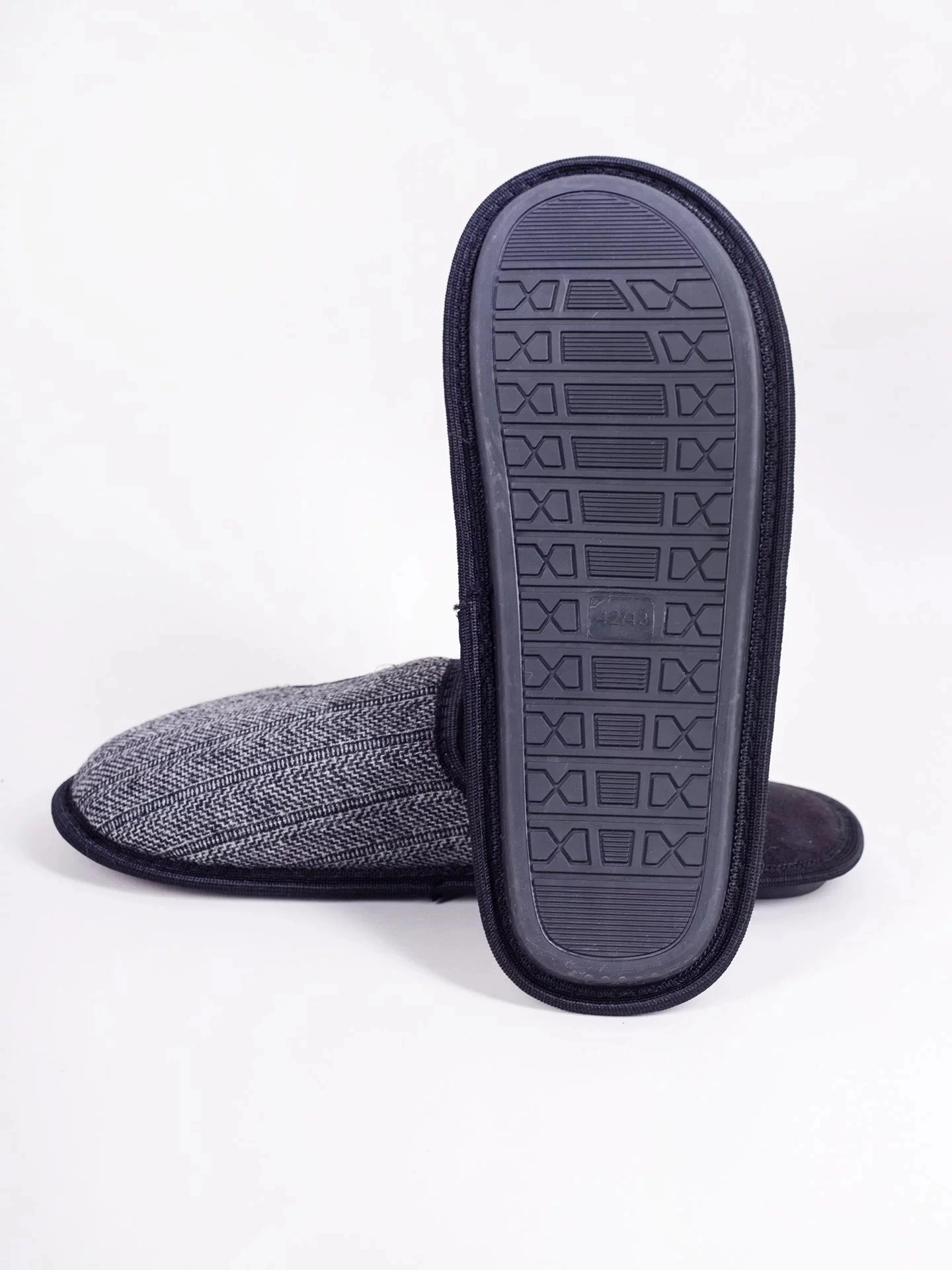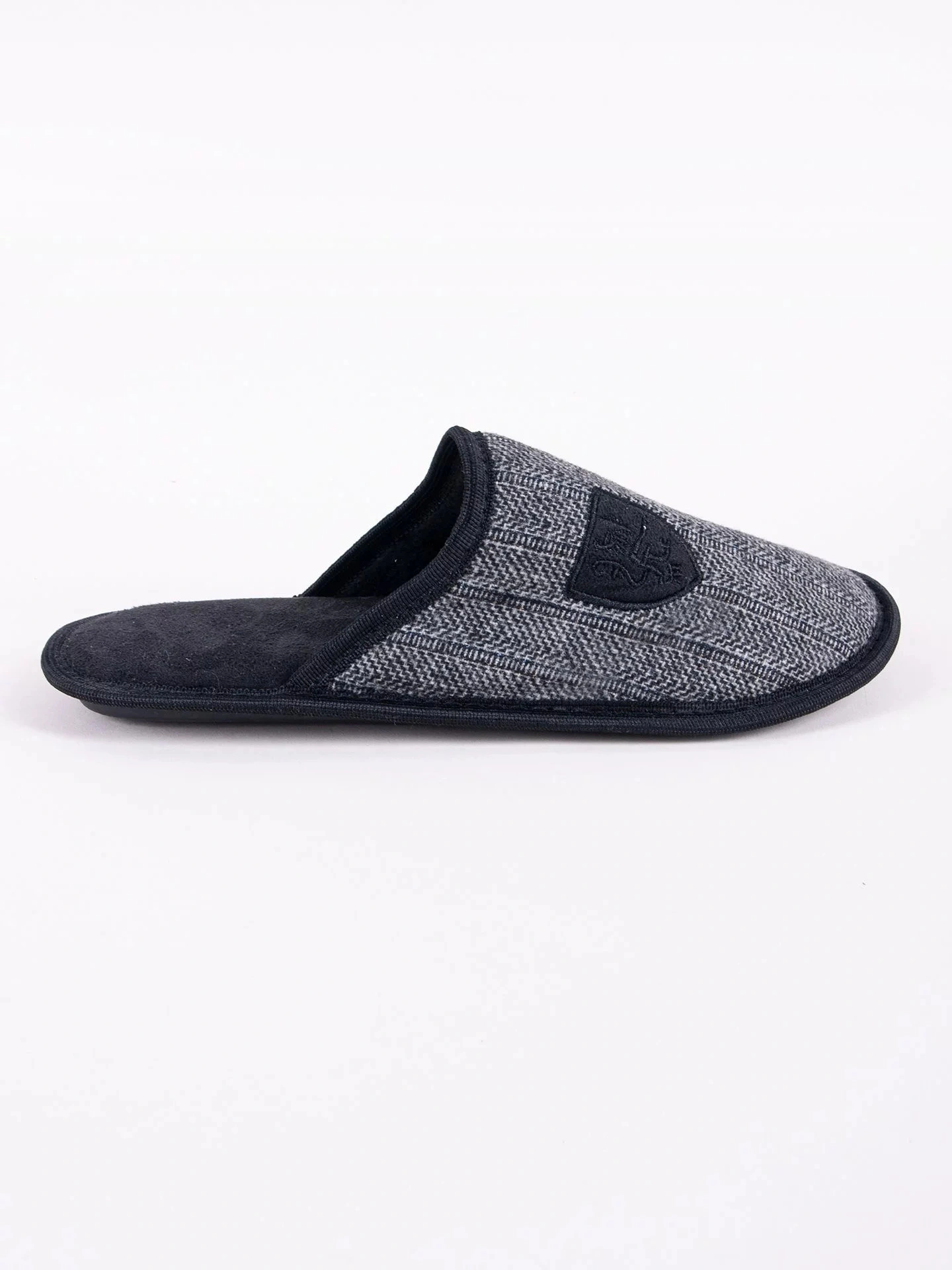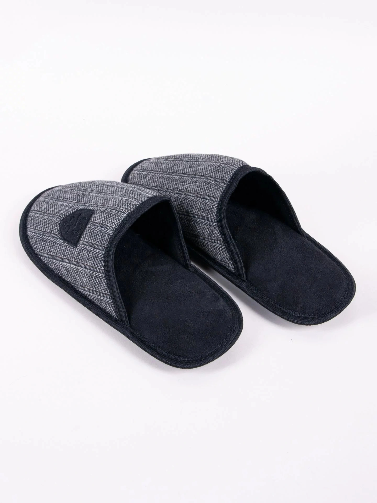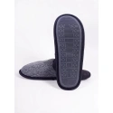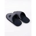 Pánske domáce papuče v univerzálnej čiernej farbe. Vzor rybej kosti na prednej strane. Nazúvacie, so zakrytými prstami. Sú praktické a pohodlné. Vo vnútri sú polstrované príjemným materiálom. Majú stabilnú podrážku, takže sa veľmi pohodlne nosia. Ideálne pre každého muža, ktorý ocení pohodlie a štýl. Sú ideálne na každodenné domáce použitie počas chladnejších dní.