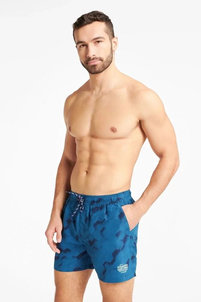 Modré bermudy s tmavomodrým geometrickým vzorom. Vhodné k bazénu aj na pláž. Vnútri všitá sieťovina pre pohodlné nosenie. Vrecká tiež zo sieťoviny.100 % polyester