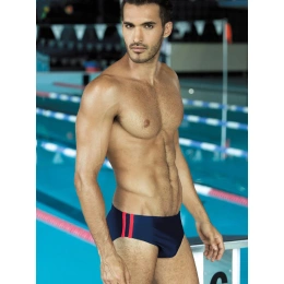 Pánske plavky slipového strihu, na gumu v páse. Na bokoch inofarebné prúžky.